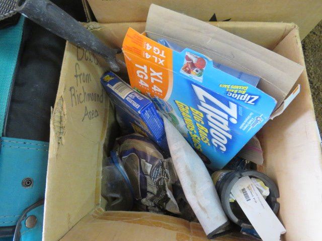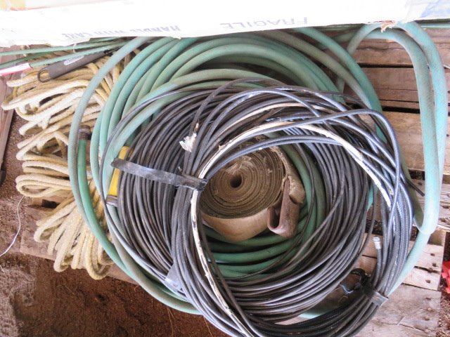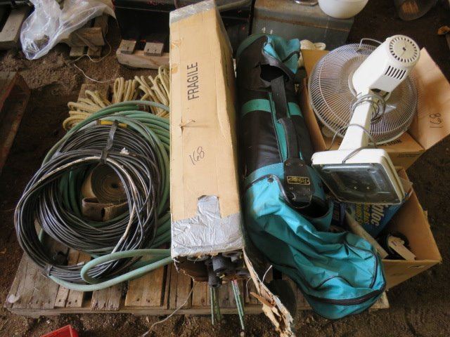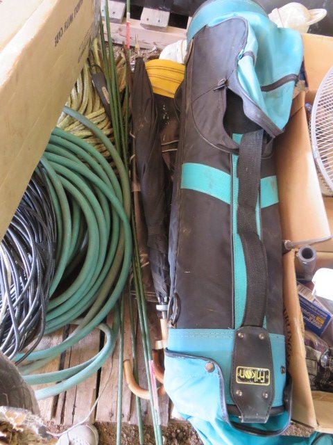 LOT OF MISC BUILDING SUPPLIES ( ROPE, HOSE, WIRE, PIPE INSULATERS, FAN, BOX OF PAINT, GOLF BAG)