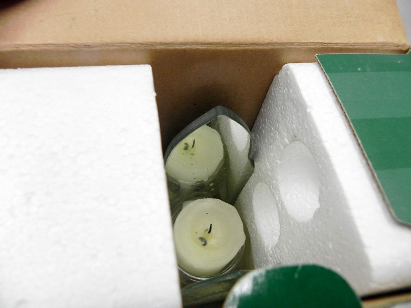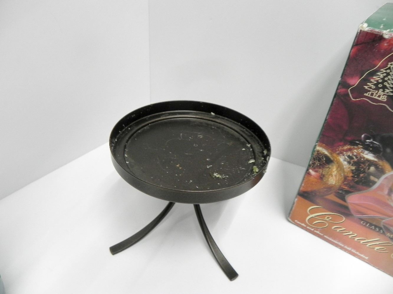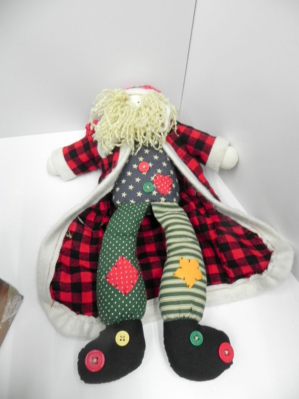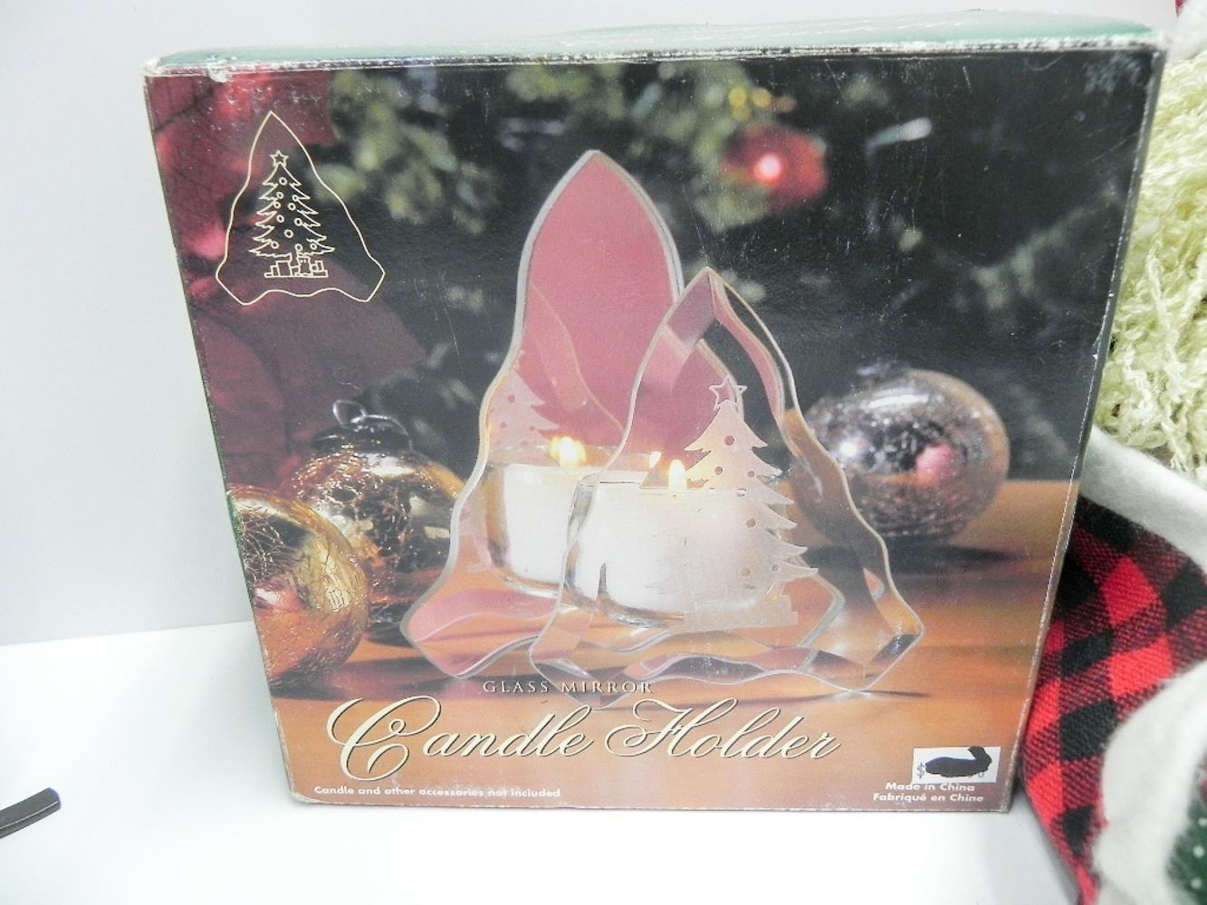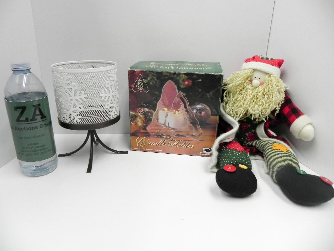 LOT OF MISC CHRISTMAS DECOR. 3 WICK CANDLE HOLDER, WHITE WIRE MESH SNOWFLAKE CANDLE DECOR, BOXED MIRROR CANDLE AND LONG KRIS KRINGLE SHELF STUFFIE