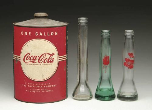 LOT OF MISC. COCA-COLA ADVERTISING ITEMS. Includes set of three rare miniature "pre-mix" bottles and a one gallon Coca-Cola syrup can with the original paper label circa 1940. SIZE: Varies. CONDITION: Bottles very good; syrup can generally good with a few dents and some paper loss. 1-4927 PF