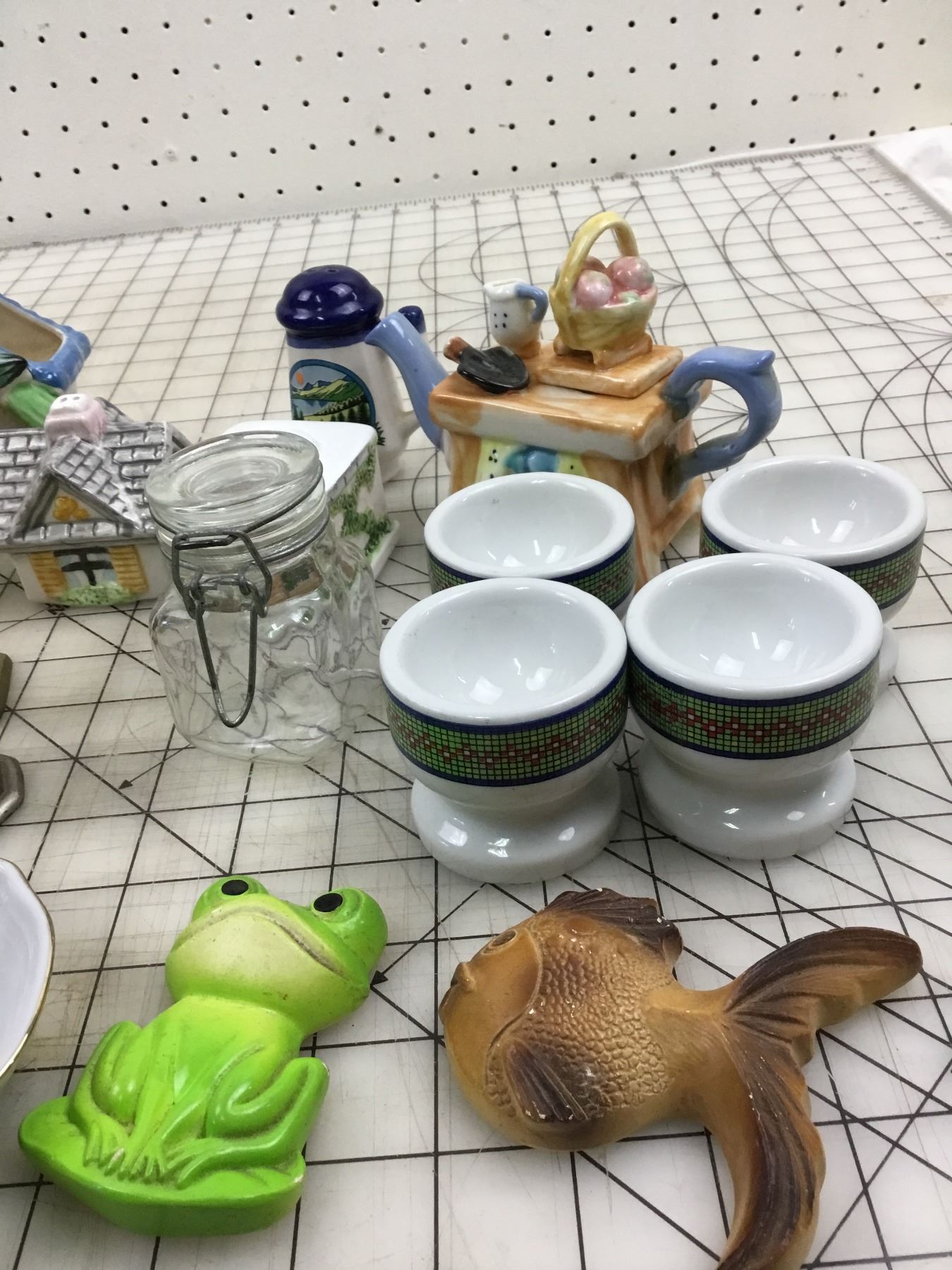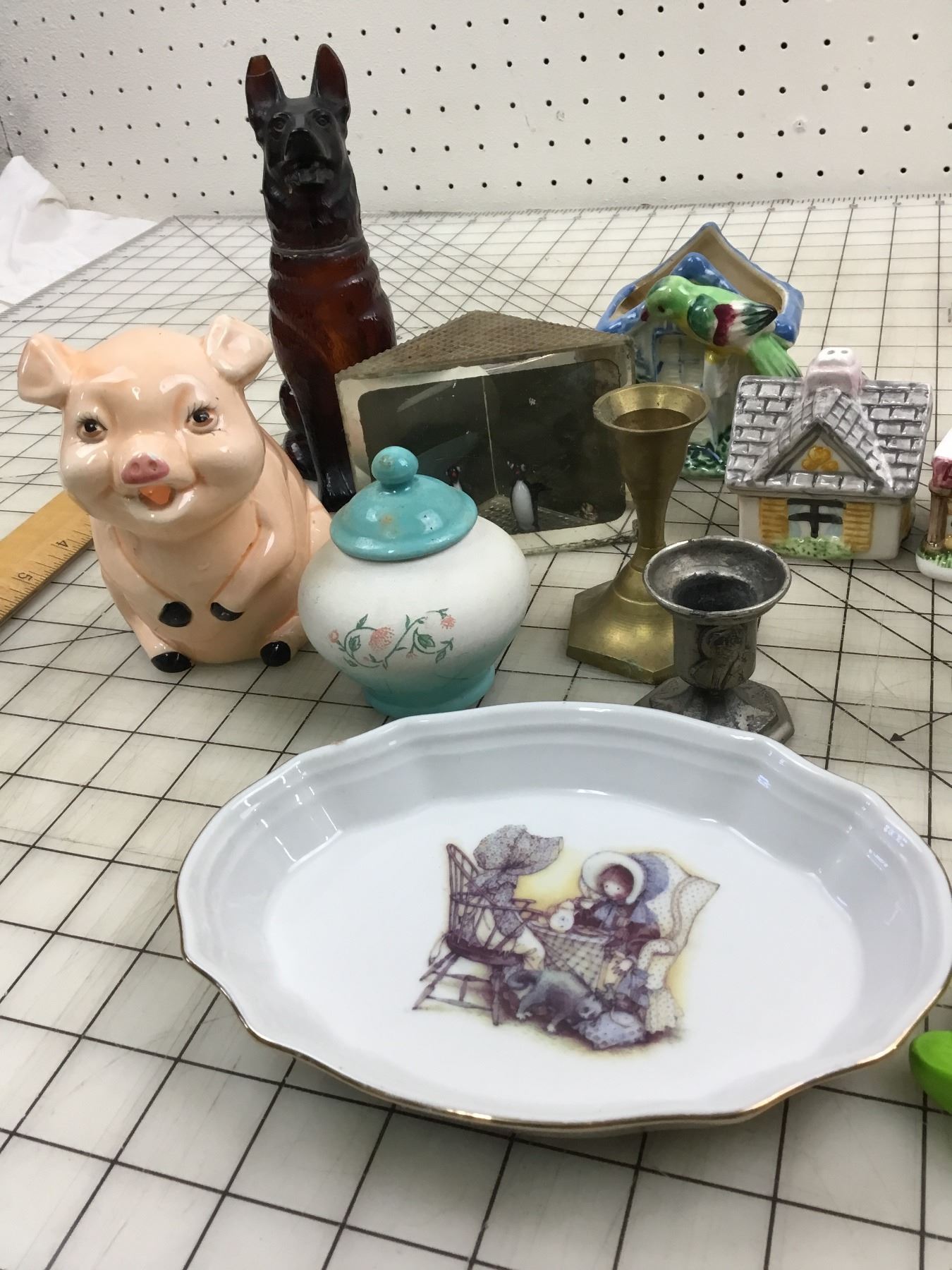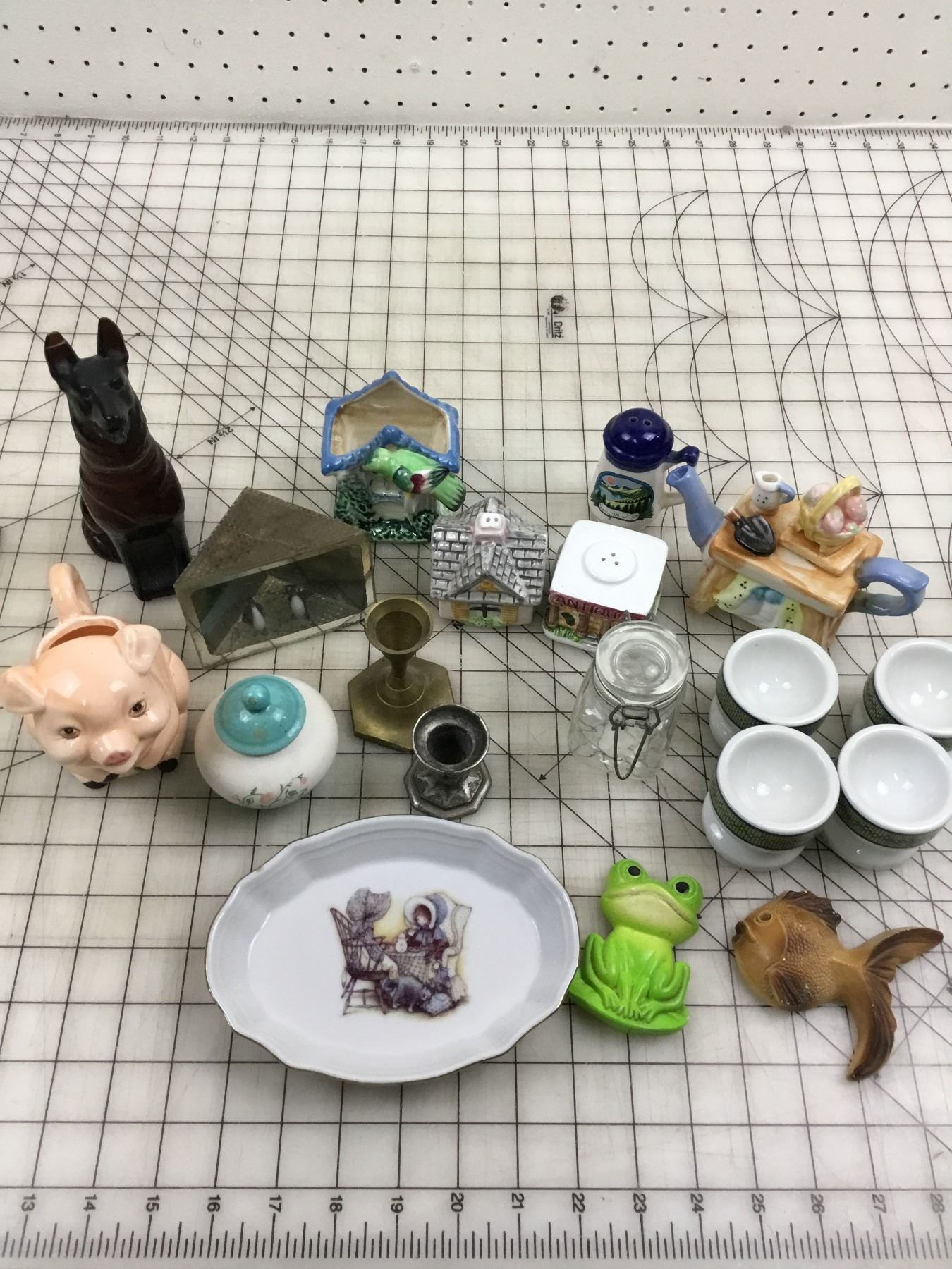 LOT OF MISC FIGURINES, CANDLE HOLDERS, SALT AND PEPPER SHAKERS, ETC