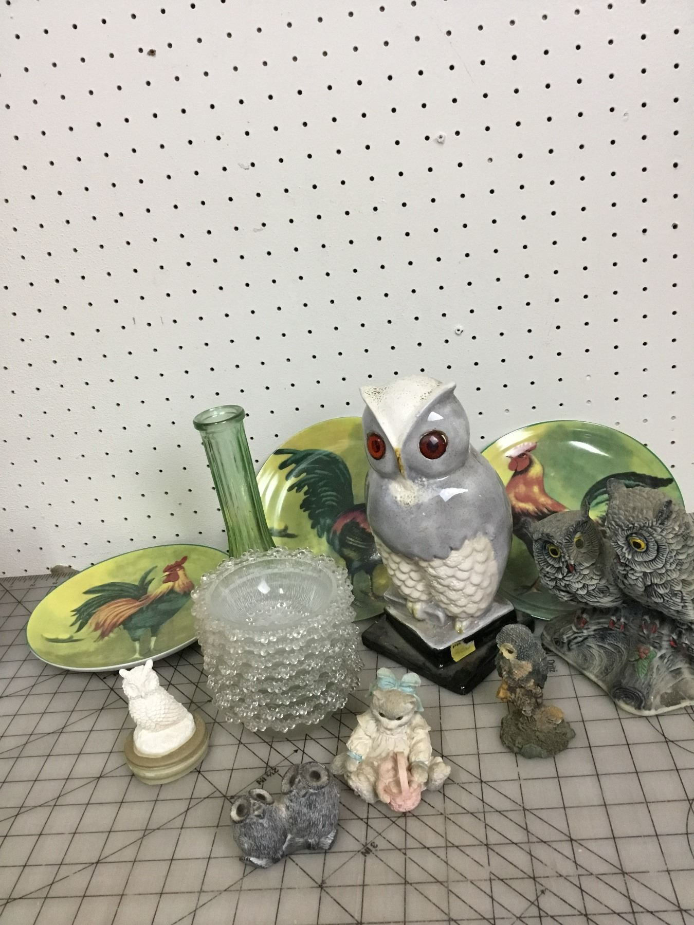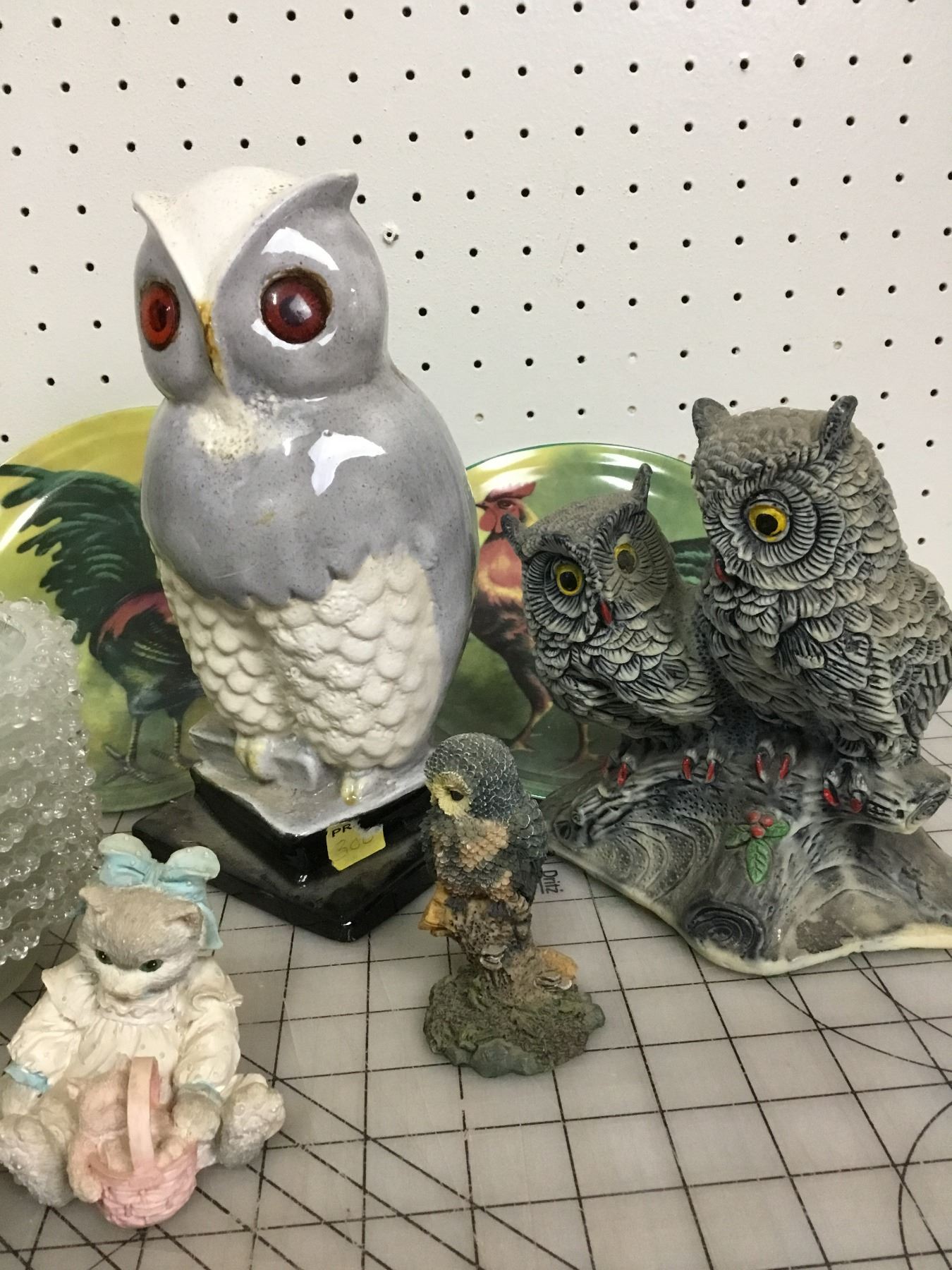 LOT OF MISC FIGURINES DECORATIONS OWLS ETC