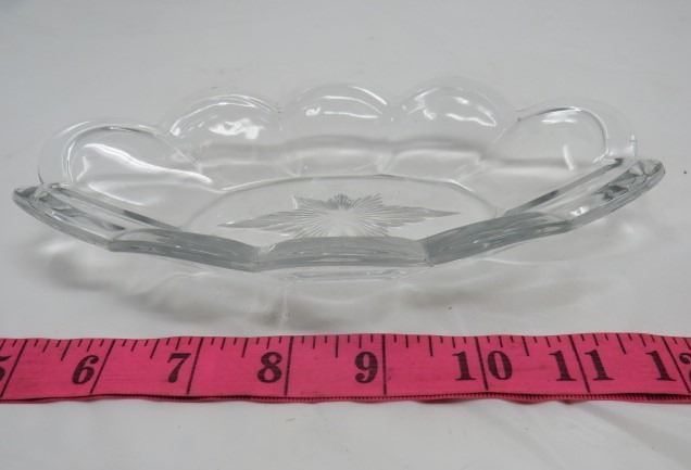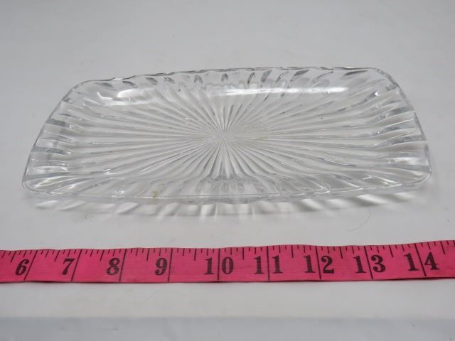 LOT OF MISC GLASSWARE (TRAY, CANDY DISH, 2 X FOOTED BOWLS, ETC)