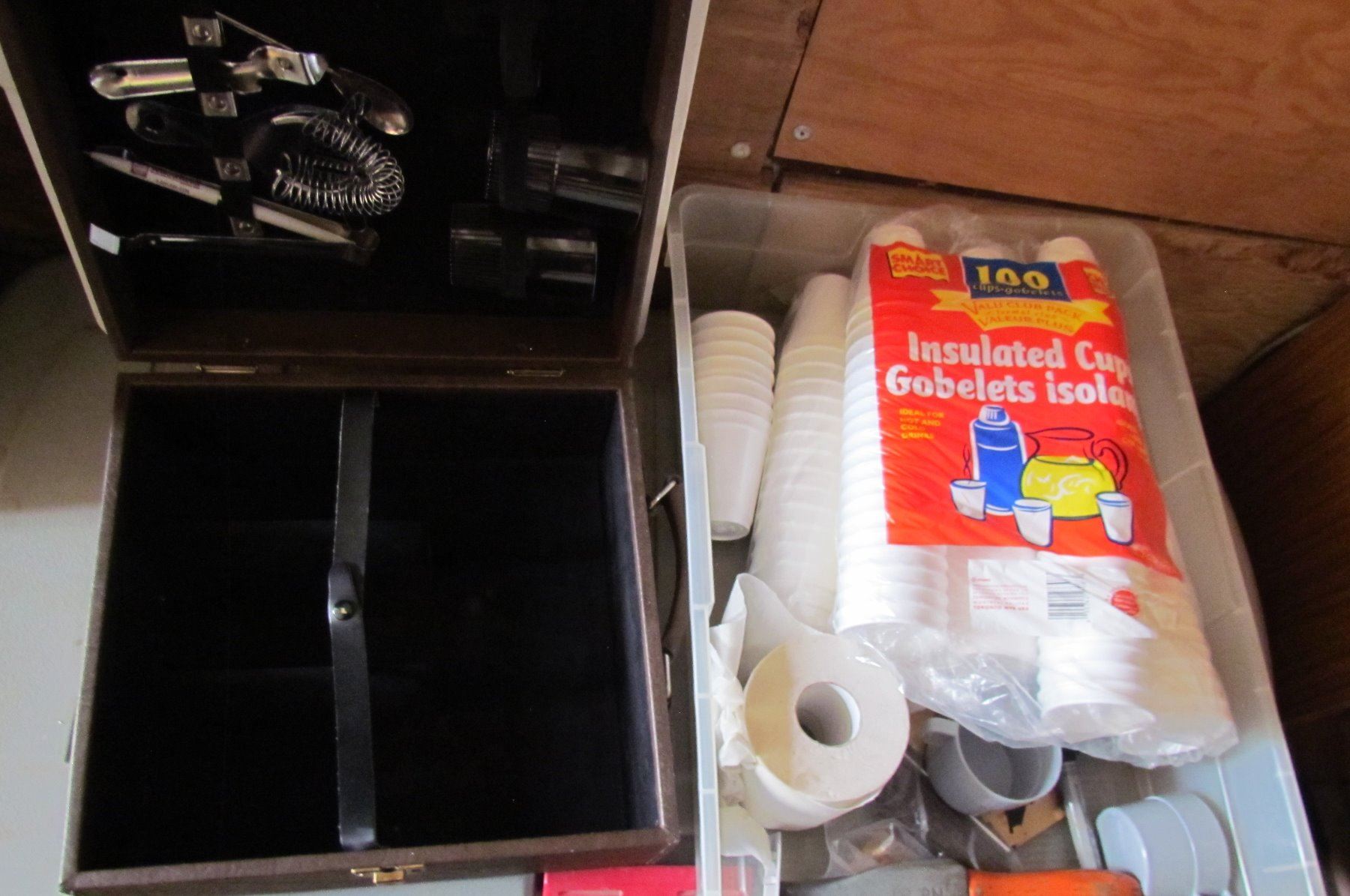 LOT OF MISC HOUSEHOLD (BAR SET, SHARPENING STONE, DISPOSABLE CUPS, ETC)