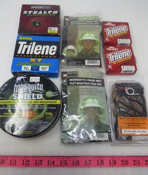 LOT OF MISC HUNTING ITEMS (2 X MOSQUITO HEAD NET) *2 X BERKLEY TRILINE* (GUN BORE CLEANER) *SPIDER WIRE STEALTH* (BERKLEY TRILINE XT GREEN)