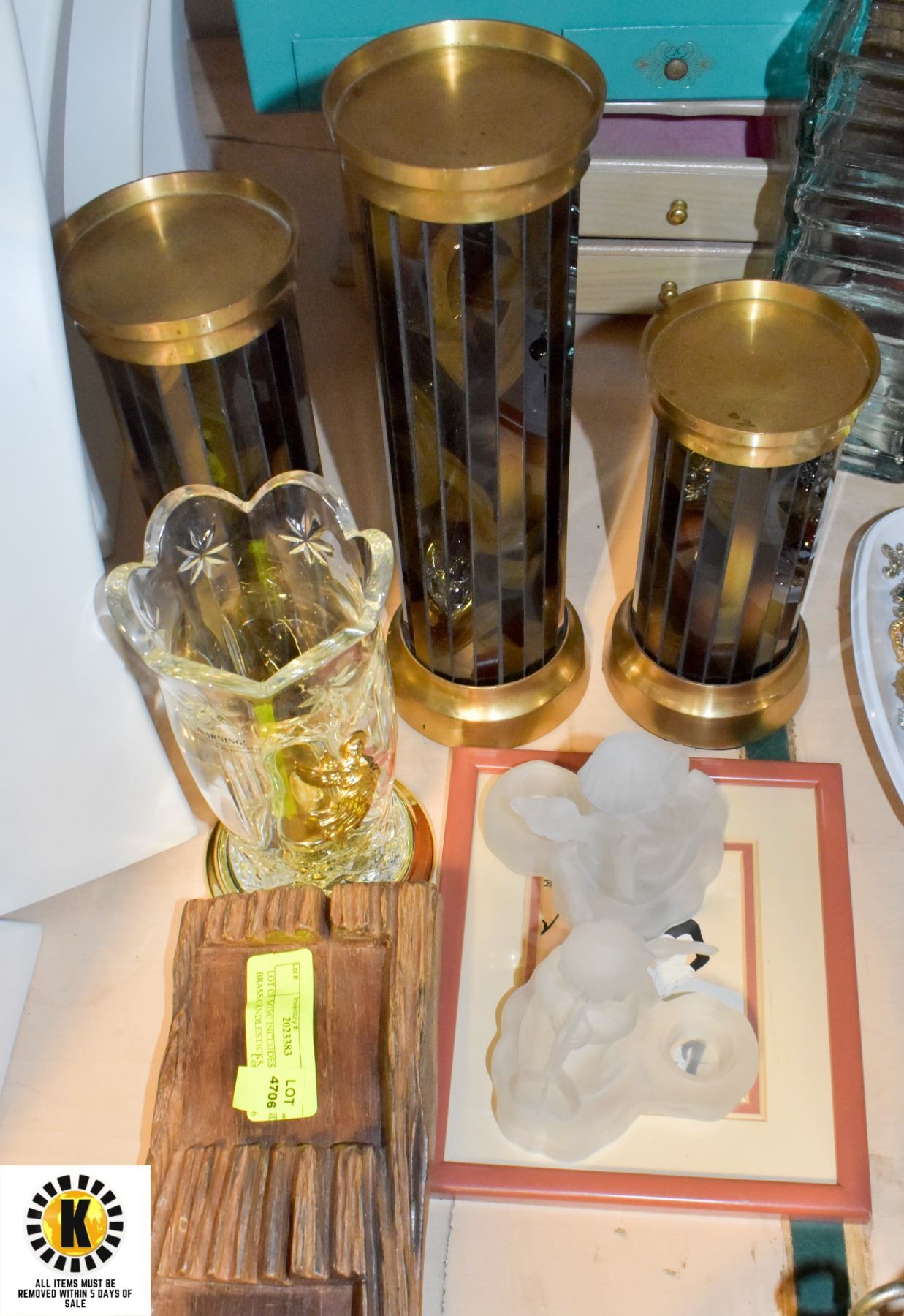 LOT OF MISC INCLUDES GLASS AND BRASS CANDLESTICKS,