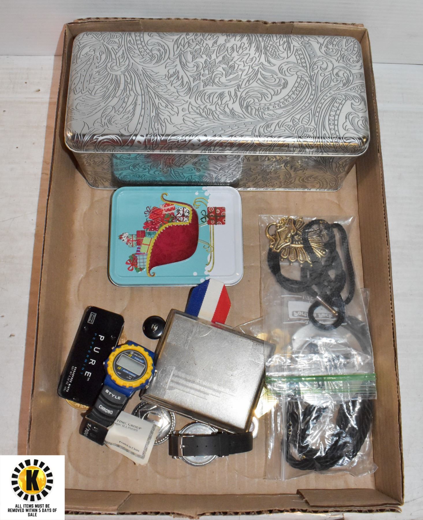 LOT OF MISC INCLUDES WATCHES, TINS, JEWELRY & MORE