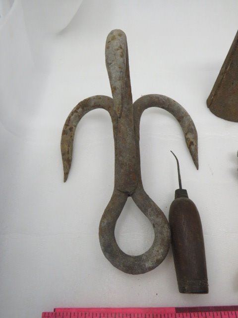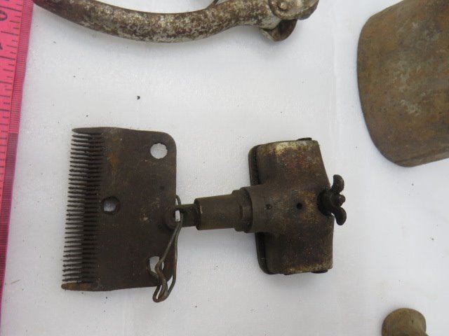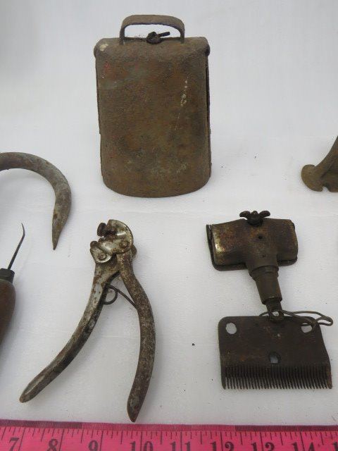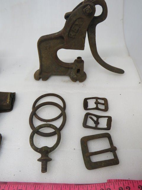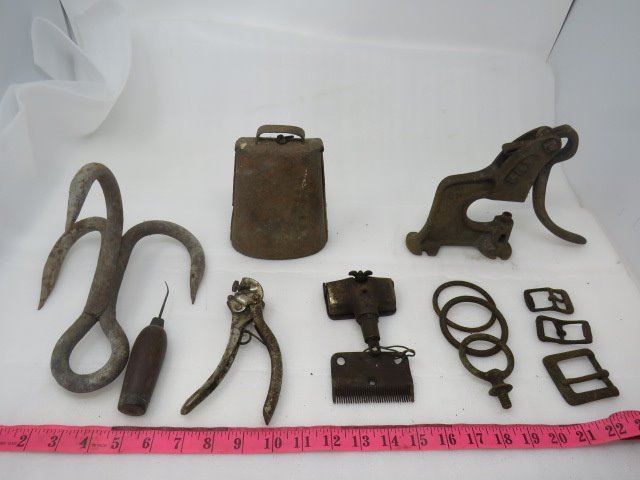LOT OF MISC ITEMS (COW BELL, BRASS BUCKLES, HOOK RIVETER, ETC)