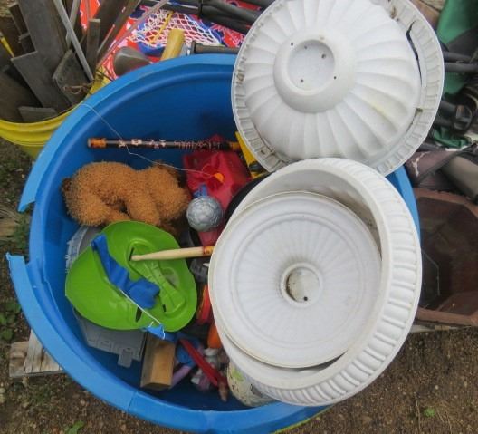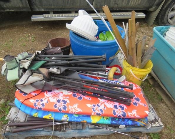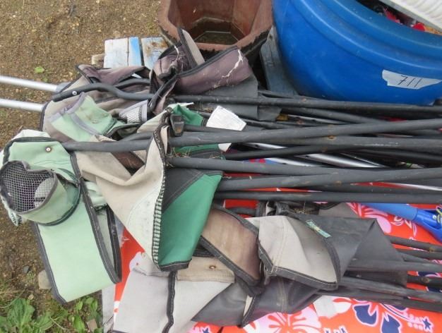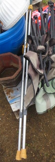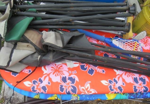 LOT OF MISC ITEMS (FOLDING CAMP CHAIRS, 2 X BOOGIE BOARDS, CRUTCHES, GOLF CLUBS, ETC)