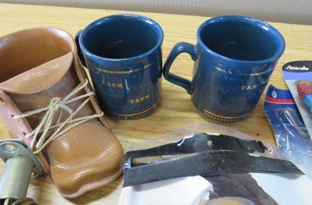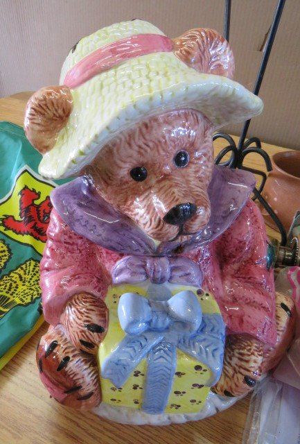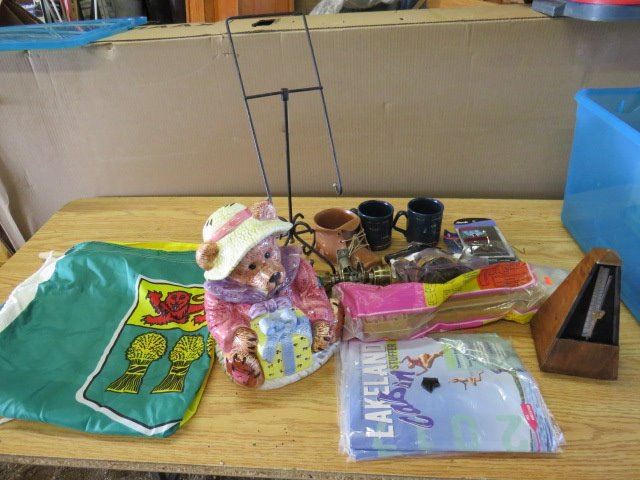 LOT OF MISC ITEMS (SASK FLAG, METRONOME, BEAR COOKIE JAR, DOOR KNOB, MUGS, ETC)