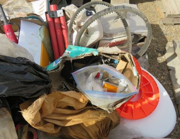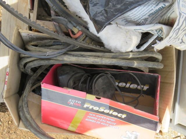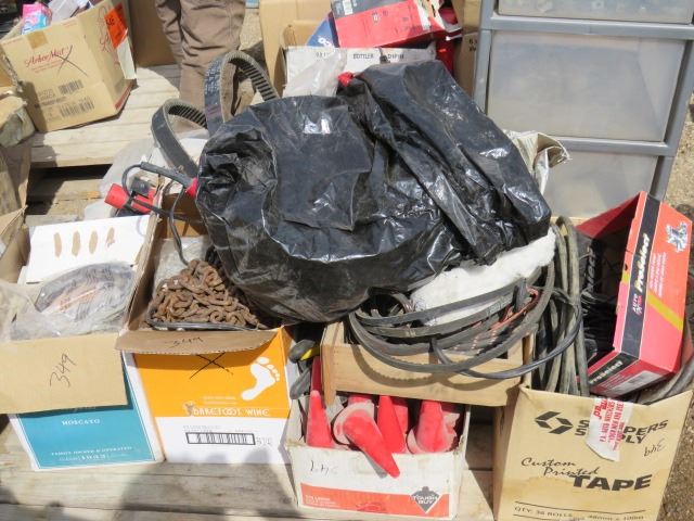 LOT OF MISC SHOP ITEMS (5 DRAWER RUBBERMAID CONTAINER, TRAILOR LIGHTS, BOX OF SMALL SAFETY CONES, CHAINS, BELTS, FILTERS, ETC)
