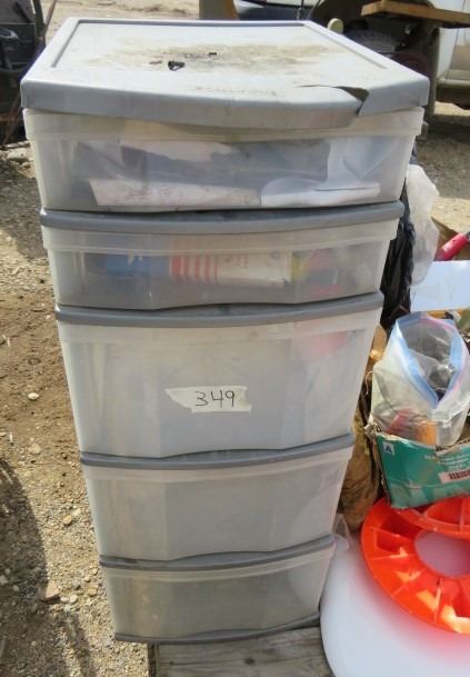 LOT OF MISC SHOP ITEMS (5 DRAWER RUBBERMAID CONTAINER, TRAILOR LIGHTS, BOX OF SMALL SAFETY CONES, CH