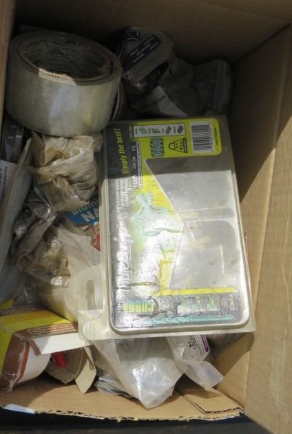 LOT OF MISC SHOP SUPPLIES (SCREWS, NAILS, ELECTRICAL ITEMS, FLOORING VINYL, ETC)