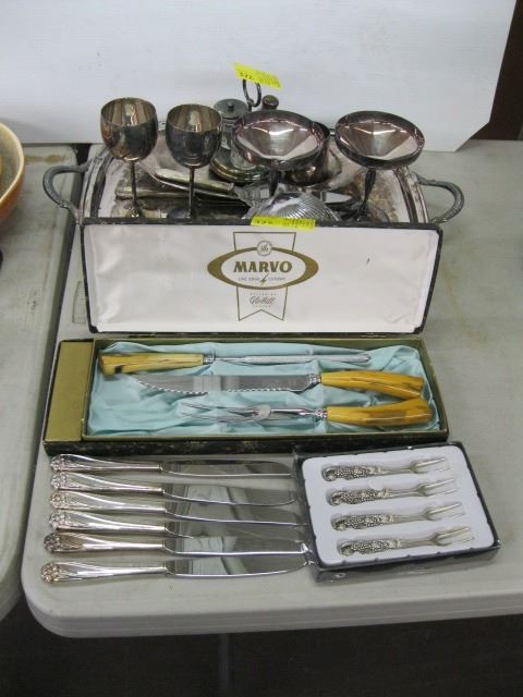 LOT OF MISC. SILVER PLATES, CARVING SETS, KNIVES, FORKS, ETC.