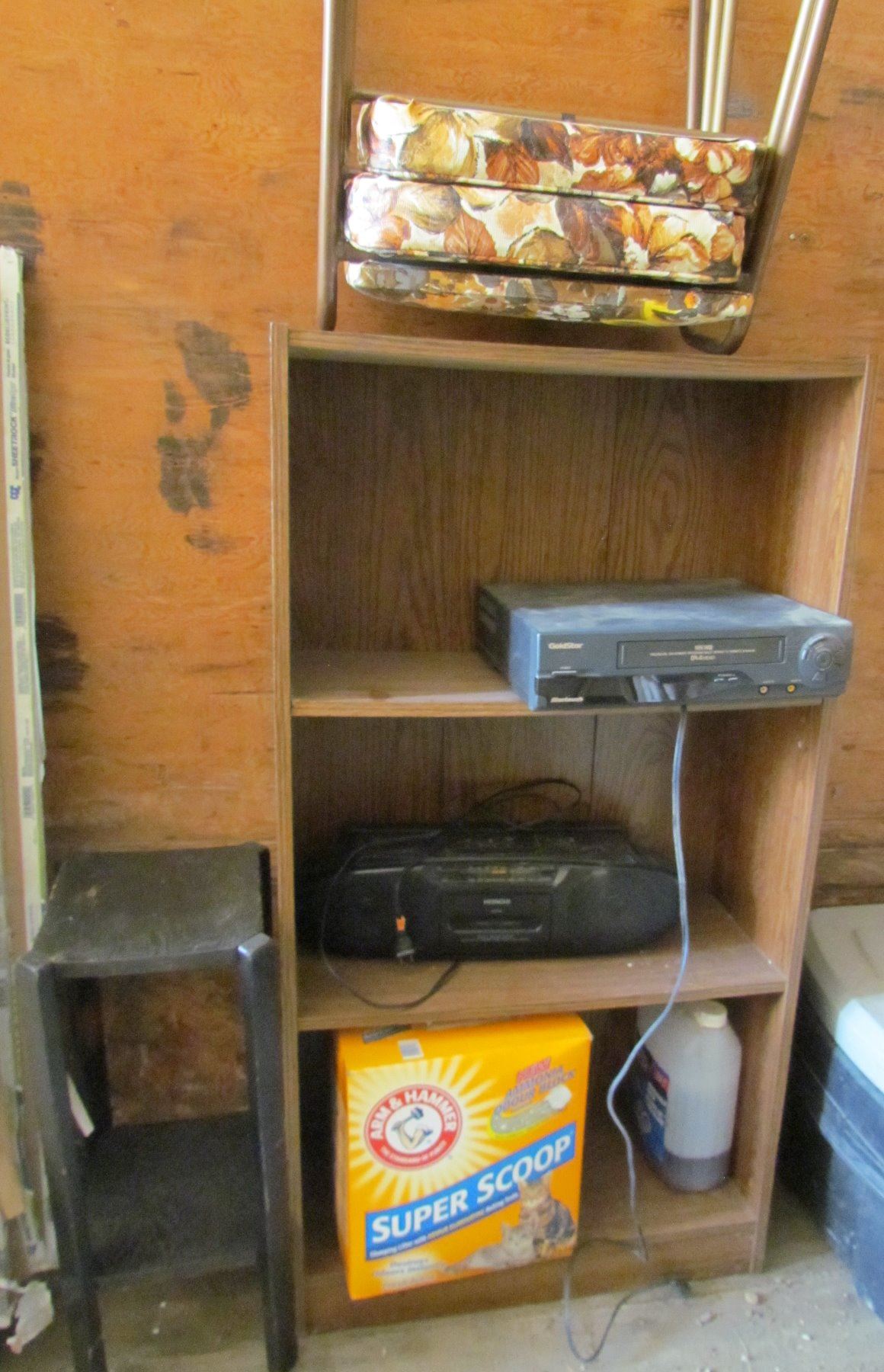 LOT OF MISC (STACKING STOOLS, SMALL STEREO, VCR, 2 SHELVES)