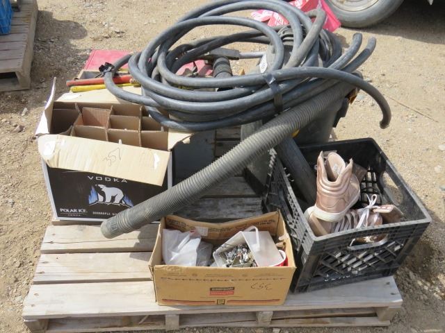 LOT OF MISC TOOLS (PUMP HOSE, FUEL PUMP HOSE, TOOL BOX, PIPE WRENCHES, PLUMBING SUPPLIES, VACUUM, ET