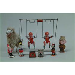 Lot # 306 LOT OF MISC. TOYS & CHRISTMAS ITEMS. Large papier-mâché and wood Sheep, Early German papier-mâché character Nodder, Tin Trapeze Artist, paper on wood animal blocks, celluloid full body Santa ornament, paper faced standing small Santa, composition face sitting Elf, standing wood Minnie Mouse figure and bisque Disney Pinocchio figure. Group of 11 tin, brand name, miniature advertising cans. Double trapeze performers. (not working) SIZE: Sheep measures 9" t. CONDITION: Lot averages good to very good, unless noted above. 1-29696, 1-29691, 1-29694 (125-250)