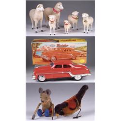 LOT OF MISC. TOYS. Lot includes: two Schuco wind-up animals, six papier-mâché and wood hand painted sheep, and a later boxed tin Pontiac coupe. SIZE: Varies. CONDITION: Good to very good. 1-3086; 1-3107; 1-3109 WP