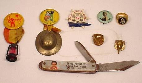 LOT OF MISC. TREASURES - Incl. Elvis Presley Pocket Knife, Marilyn Monroe Celluloid Pinback Button, James Bond 007 Ring, More!