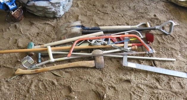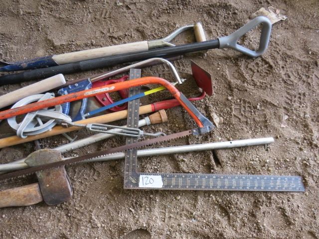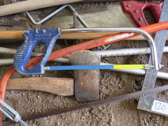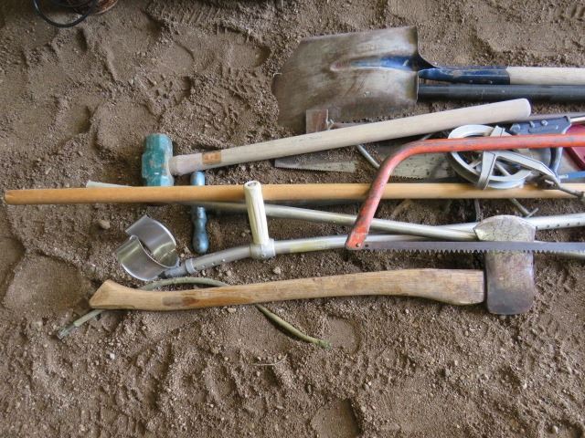 LOT OF MISC YARD TOOLS (AXES, WOOD SAWS, SHOVELS, HOE, CRUTCHES, ETC)