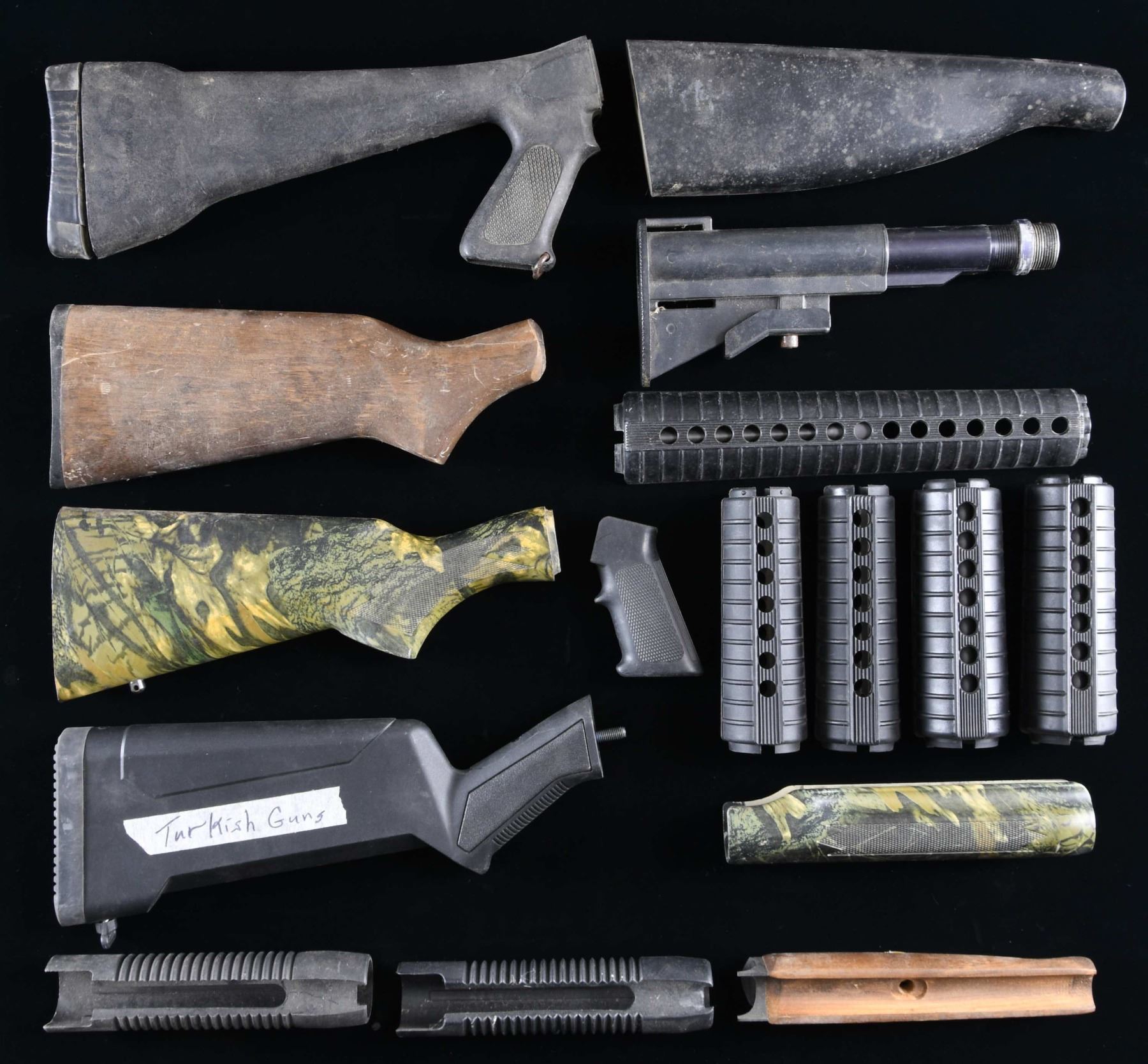 Generally fair condition resulting from poor storage. Some items with reasonable guess as to fitment as noted. Better conditions are noted. New England Firearms 410 Ga. buttstock (split at frame juncture) and forend with black plastic "iron". / Very good jungle camo finished buttstock (no buttplate) and forend appearing for Remington Model 870. / Very good black tactical style shotgun buttstock labeled "Turkish Guns". / Poor Choate Tool pistol grip buttstock that appears for unknown pump shotgun. / Poor black painted hardwood buttstock of New England Firearms configuration. / Fair (but fully functional) 3 position AR collapsible buttstock with buffer tube and lock ring. / 2 Good plastic shotgun forends that appear for 12 Ga. Mossberg Model 500's. / Good AR A2 pistol grip. / 2 Very good AR Carbine handguard sets. / 2 Very good AR M4 oval Carbine handguard sets. / Good upper half of AR rifle handguard set. (02-23889/NW). $50-100.