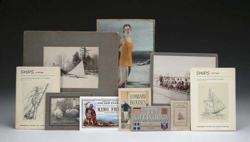 LOT OF NAUTICAL RELATED PHOTOGRAPHS AND EPHEMERA. Includes two pictures of ice boats, a group of canoe and pond related boats, some small pamphlets and a photograph of a miniature steam train at Old Orchard Beach, Maine. SIZES: Vary. CONDITION: Generally very good. 9-27698-5