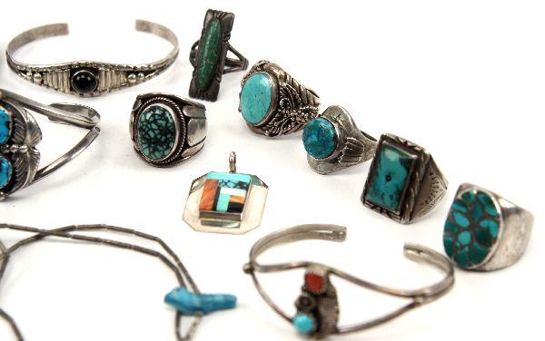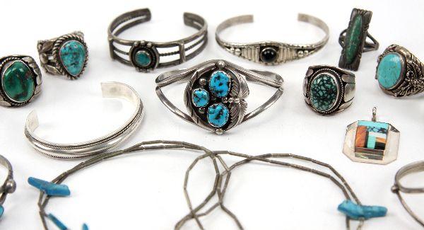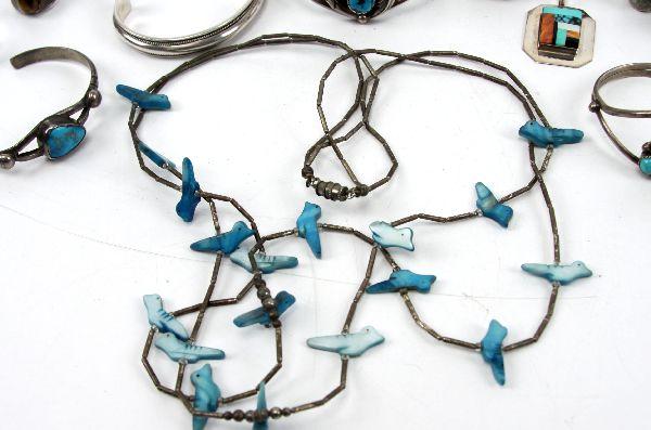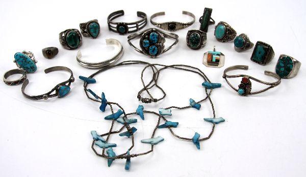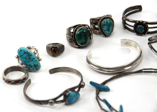 Grouping of (8) men's rings, (3) women's rings, (6) cuff bracelets, a fetish necklace, and a Zuni pendant. Many signed pieces. Weight: 9.15 ozt Condition: Very good