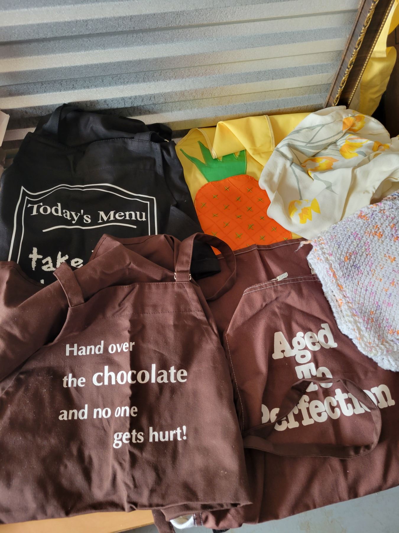 LOT OF NEW AND VINTAGE APRONS, DISH CLOTHS