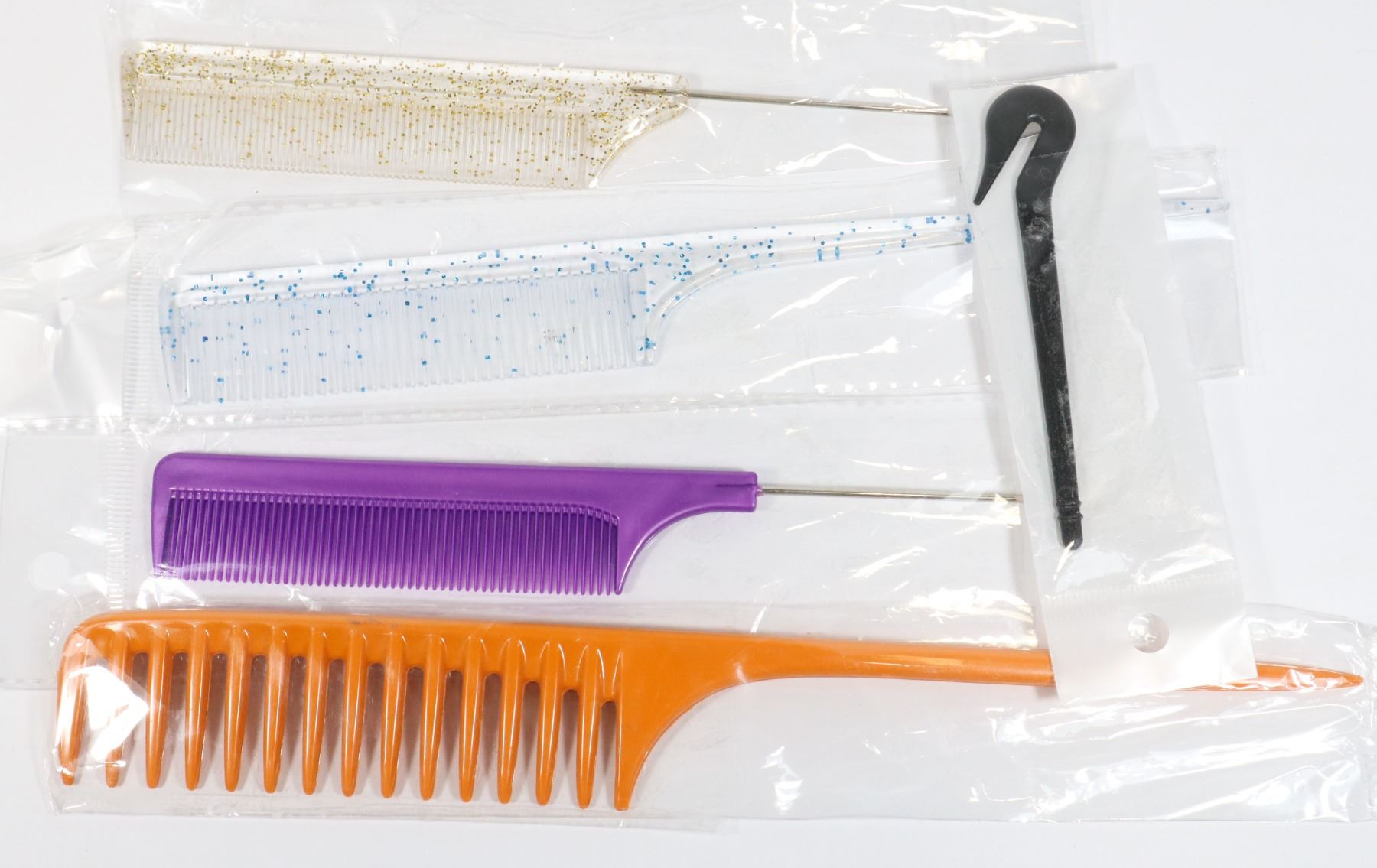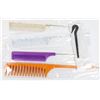 BLUE GLITTER RAT TAIL COMB, WIDE TOOTH RAT TAIL COMB, BARBER SALON FINE RAT TAIL COMB, GOLDEN GLITTER FINE TOOTH COMB AND ELASTIC BAND CUTTER