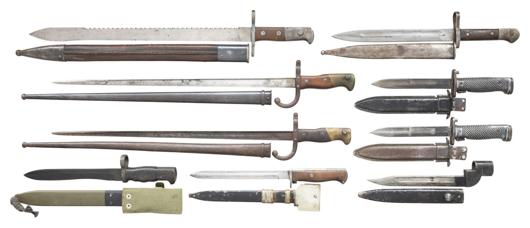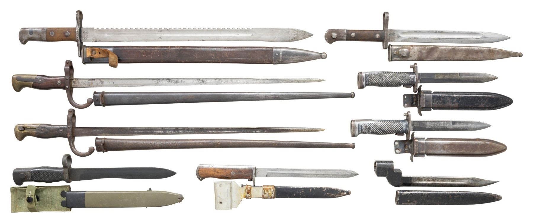 This lot consists of the following assorted bayonets: 1) Spanish CETME Bayonet. Scabbard & frog present. CONDITION: metal shows light oxidation, scuffing & edge wear. Grips show dings, chipping & handling marks. Scabbard shows scattered scuffing & scratches. 2) Turkish M5 Garand Bayonet. All metal construction. MKE marked scabbard. CONDITION: blade shows heavy sharpening wear. Metal is an overall gray color with oxidation, edge wear & fading. Belt hook shows notable heavy wear. 3) Turkish M5 Garand Bayonet. All metal construction. MKE marked scabbard. CONDITION: scabbard shows strong remnants of black enamel finish with overall flaking. Metal parts show scattered usage wear, dings & oxidation. 4) French M1874 Gras Bayonet. 1879 dated & St. Etienne made. Mismatched scabbard present. CONDITON: blade is a silvery gray color with oxidation Other metal parts of bayonet & scabbard are a dull gray with oxidation. Wooden handles show dings & handling marks. 5) French M1874 Gras Bayonet..1879 dated & St. Etienne made. Mismatched scabbard present. CONDITION: large part of bayonet latch is missing. Scabbard & crossguard are a dull gray pitted patina with dents. Brass parts are a dull yellow oxidized patina with dings. Blade is a dull gray oxidized patina. Handles have a dark appearance with dings & handling marks. 6) British No. 9 MKI Bayonet. No visible markings. Scabbard present. CONDITION: bayonet & scabbard show heavy flaking Suncorite with some oxidation. 7) Swiss M194 Sawback Bayonet. Blade has Neuhausen marking. Leather scabbard present. CONDITION: metal parts of bayonet show scattered oxidation, dings & hading to gray. Wooden panels show some dings. Scabbard shows crazing & flaking. 8) Turkish M1935 Bayonet. Pommel has "AFSA" marking. Scabbard present. CONDITION: metal parts of bayonet & scabbard are a gray patina with oxidation dings & dents. Handles show heavy wear & dirt staining. 9) Norwegian 1894 Krag bayonet. Scabbard present with wire wrapped metal frog that appears to be a later non-military replacement. CONDITION: metal parts of bayonet show scattered fading to gray, scratches, dings & oxidation. Grip panels show staining & dings. Scabbard shows flaking enamel, oxidation & wear. (02-24131/MJC). NON-GUN. $300-500 for lot.