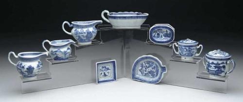 LOT OF NINE PIECES OF BLUE AND WHITE CANTON. Lot includes 3” h creamer, 3-1/2” h creamer, 2-1/2” h creamer, 2” h x 7” sauce boat; 3” h covered sugar; 4” h covered sugar; 1-1/4” x 3-1/2” master salt; 6” leaf dish; 3-1/4” square dish. CONDITION: Generally very good. Larger sugar cover is broken. Some minor edge roughness. 9-27468-1