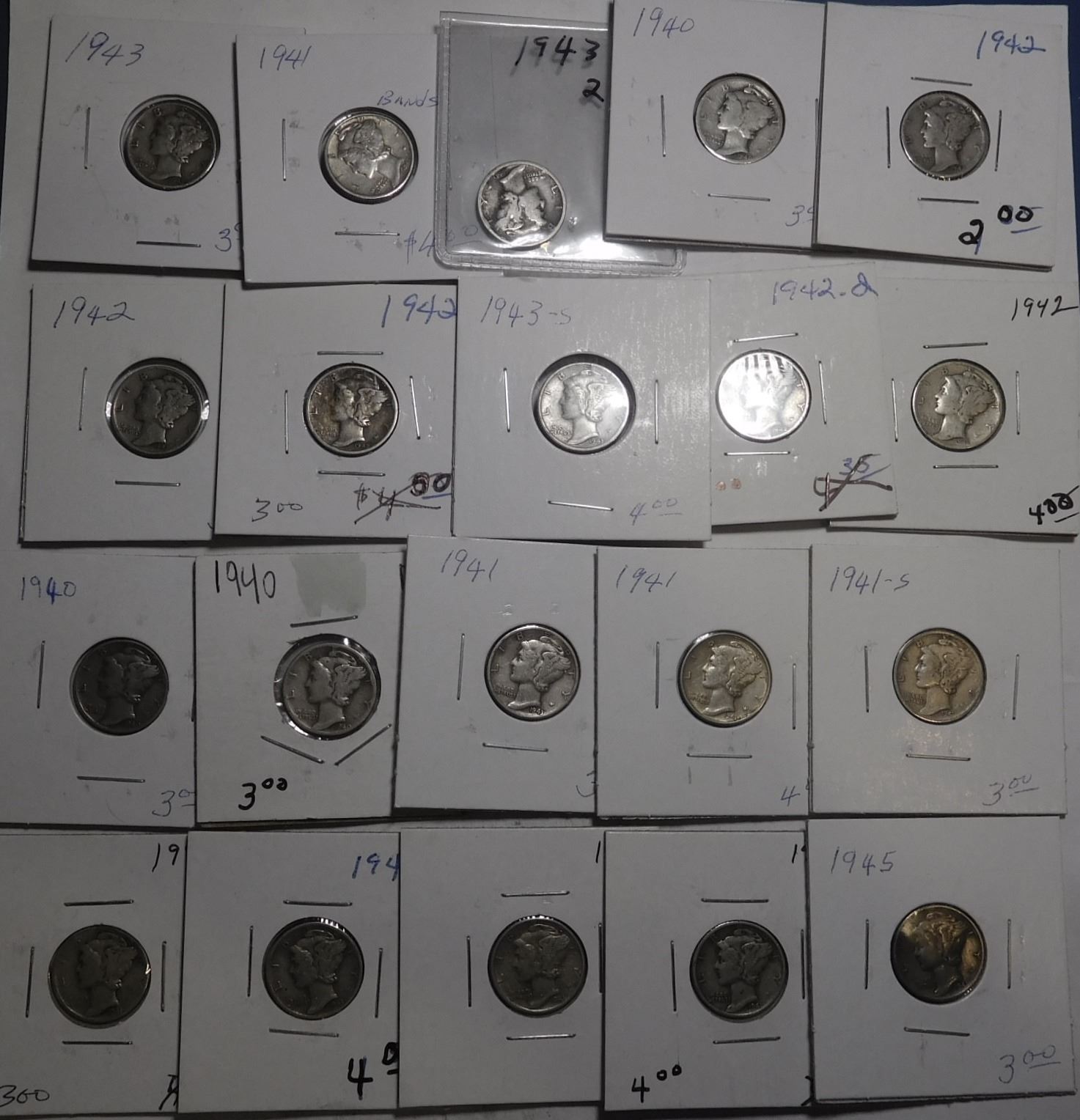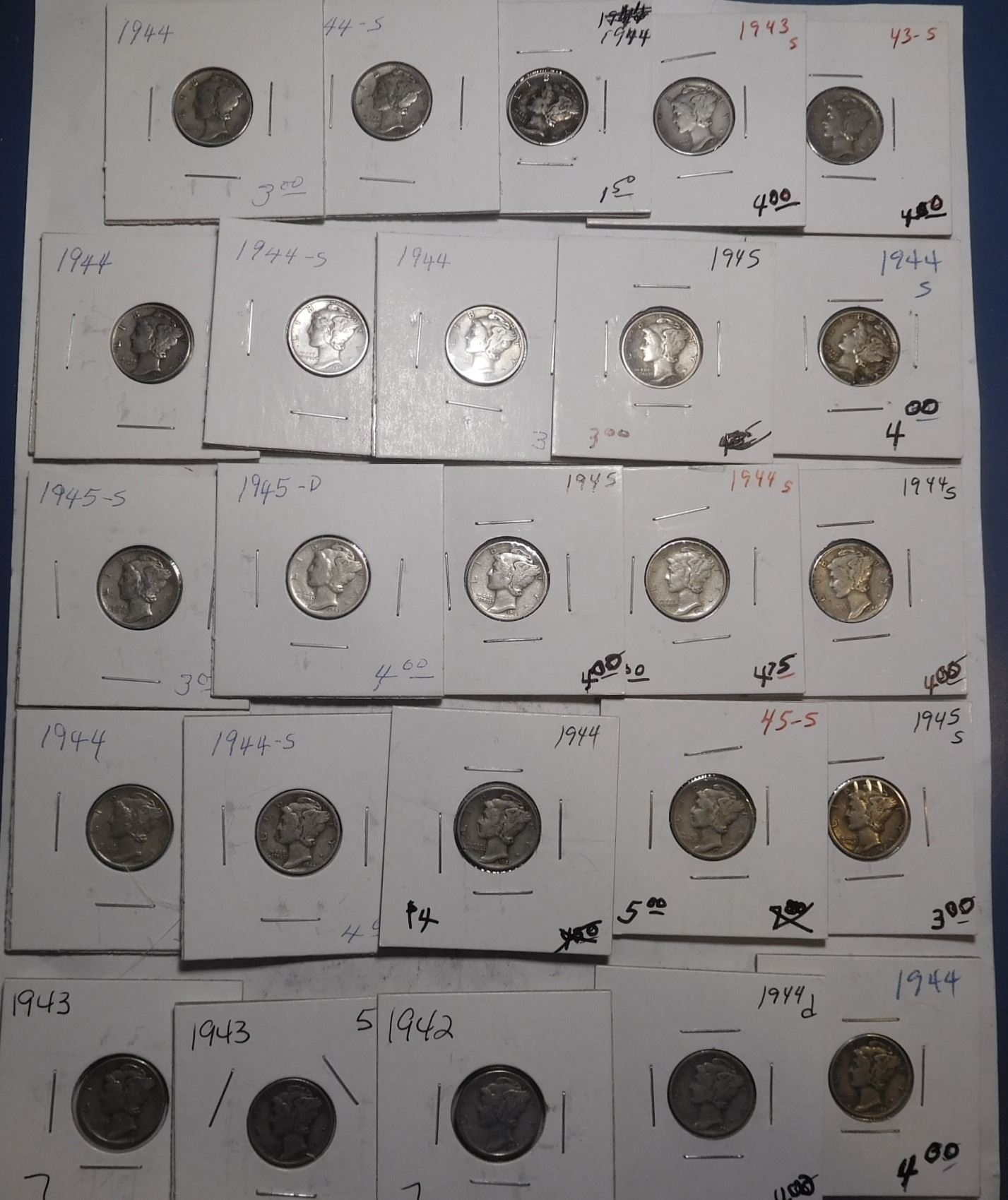 LOT OF NINETY FIVE MIXED DATE 1940'S MERCURY DIMES VG-VF (95 COINS)
