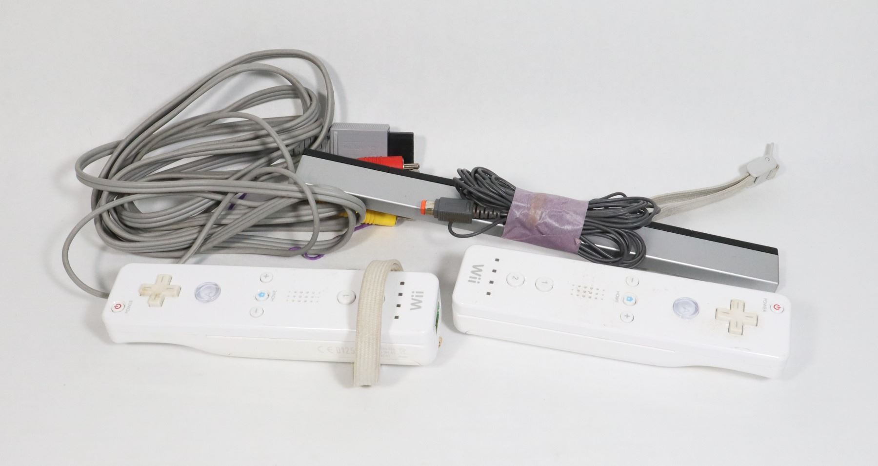 NINTENDO WII WIRE AV CABLE, WII SENSOR BAR, AND 2 WII REMOTE CONTROLLERS RVL-003