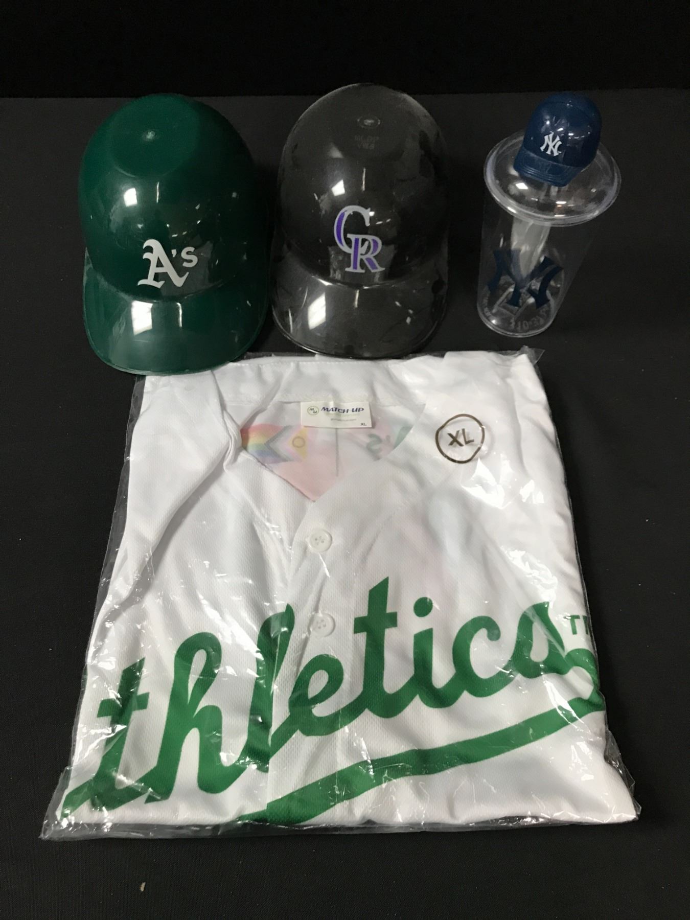 LOT OF OAKLAND ATHLETICS MEMORABILIA INCLUDING HELMETS AND A JERSEY