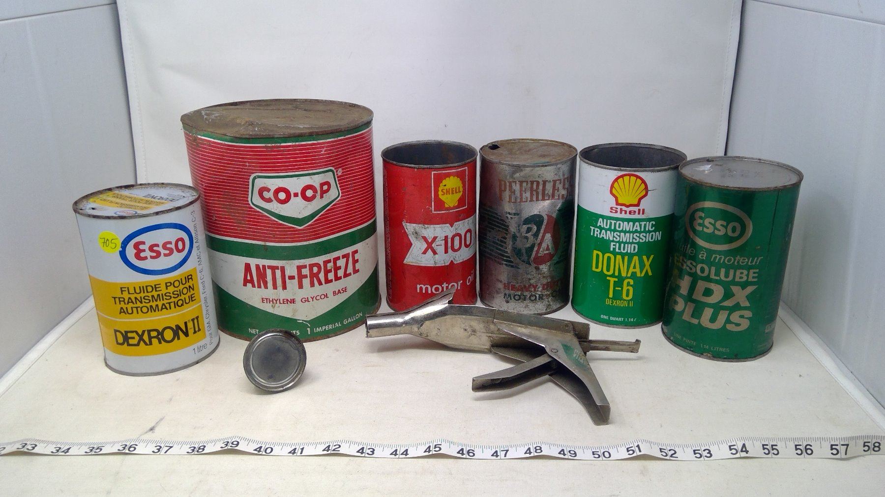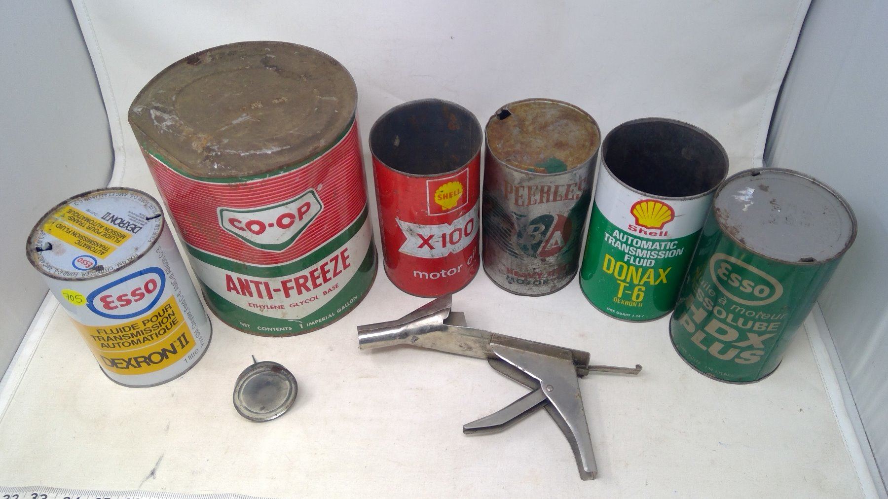LOT OF OIL/ANTIFREEZE/TRANSMISSION FLUID CANS & GREASE DISPENSER (ALL CANS ARE EMPTY)