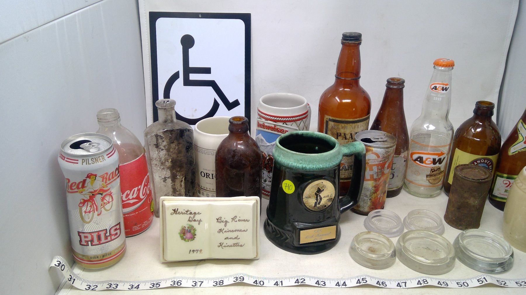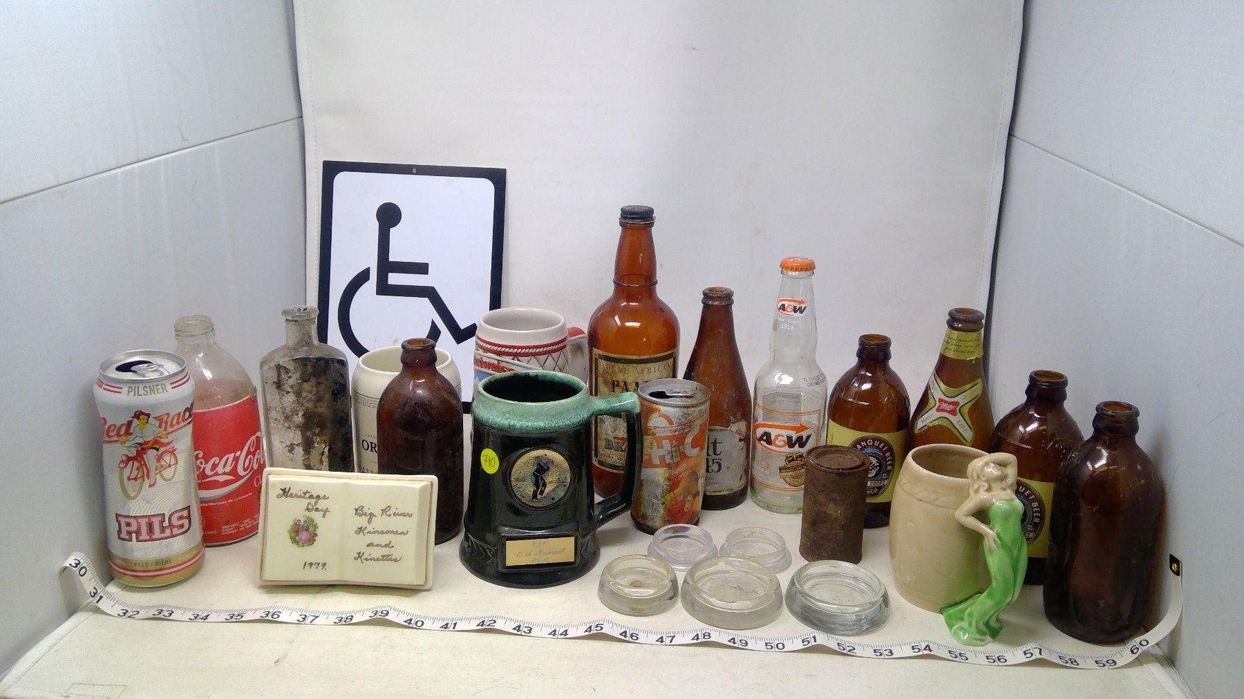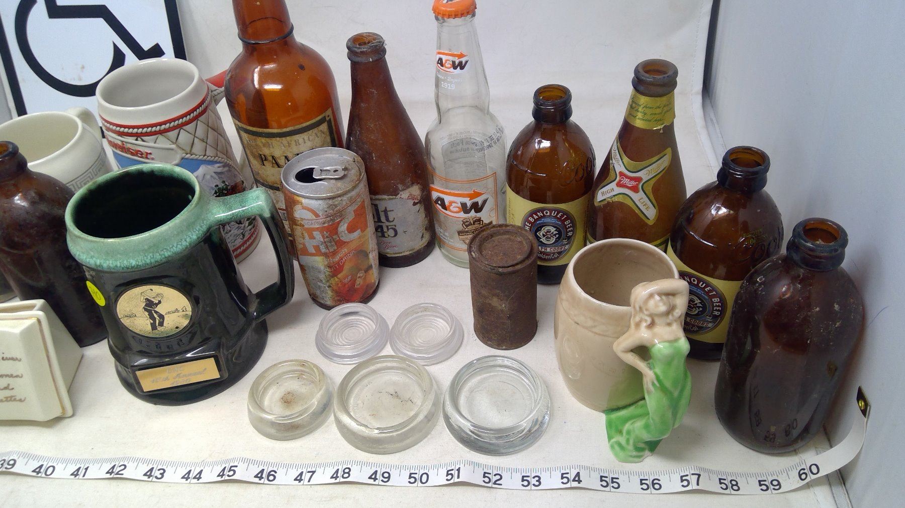 LOT OF OLD BOTTLES CUPS CANS AND MISC TREASURES