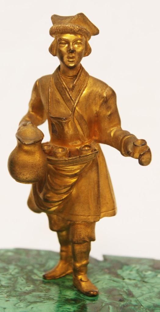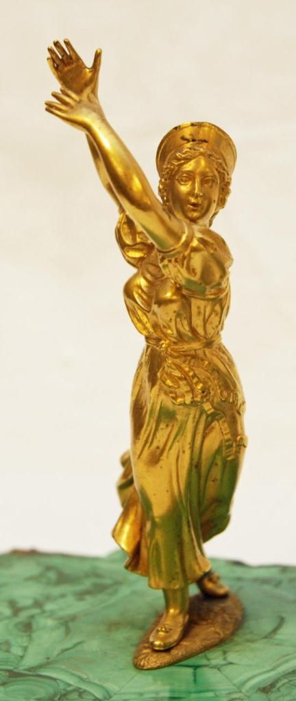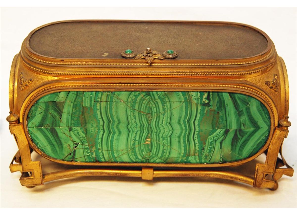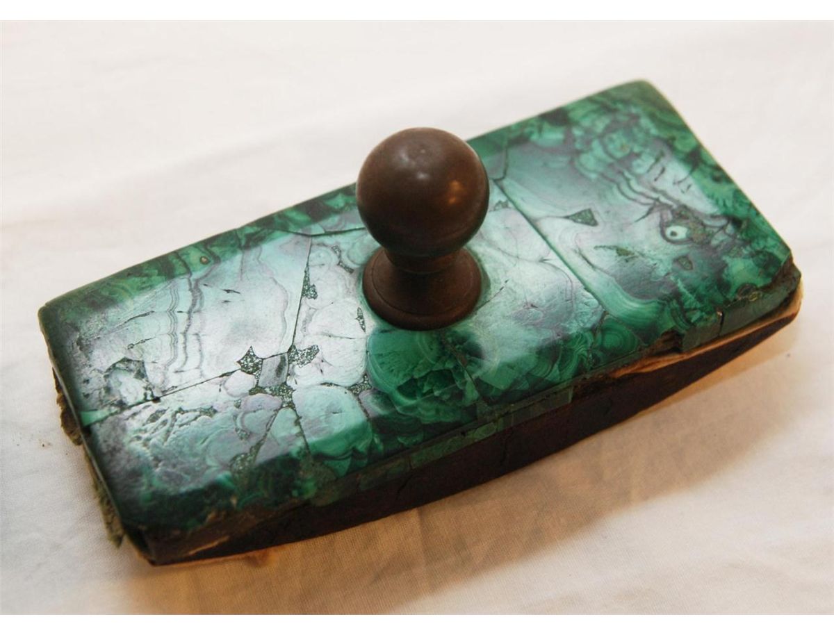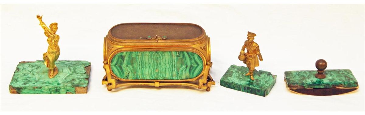 Lot of old malachite and gilded metal pieces. Includes a footed rectangular box. Ink blotter with bronze handle. Also includes two standing figures on rectangular bases. Late 19th to early 20th century. Largest piece measures 9 1/4" length (23.4cm). Total weight of approx. 3.58 kilograms.