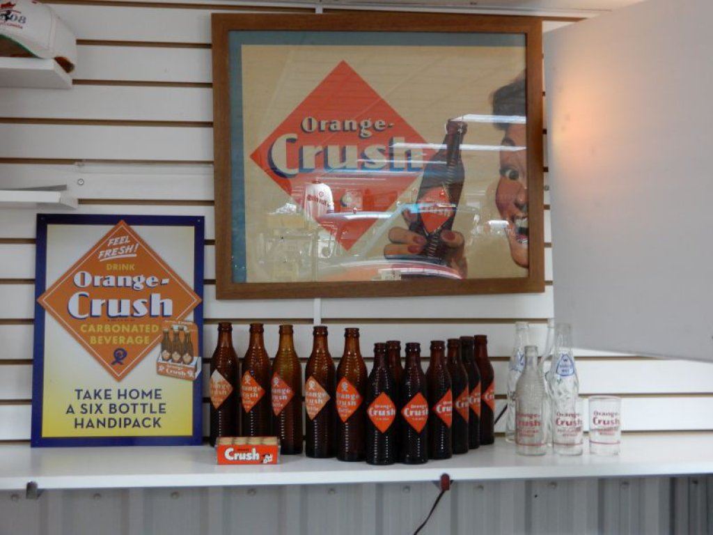 LOT OF ORANGE CRUSH FRAMED ORANGE CRUSH ADVERTISMENT 26" X 21 1/2" - SST SIGN 17 1/4" X 12 1/2" - ORANGE CRUSH BOTTLES - GLASSES - SMALL WOODEN CASE LOCATION: SODA SHOP
