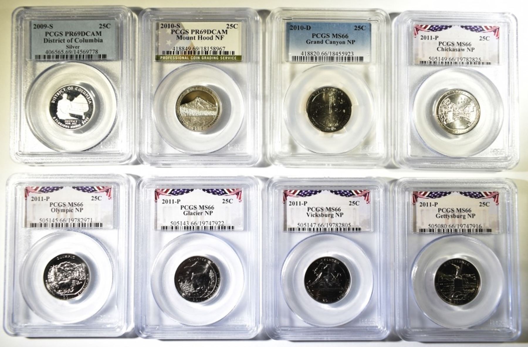 2010-D GRAND CANYON MS-66, 2011-P OLYMPIC, GLACIER, BICKSBURG, GETTYSBURG, AND CHICKSAW ALL MS-66, 2009-S DC SILVER PR-69DCAM, AND 2010-S MOUNT HOOD PR-69DCAM ESTIMATE $80 - $90.
