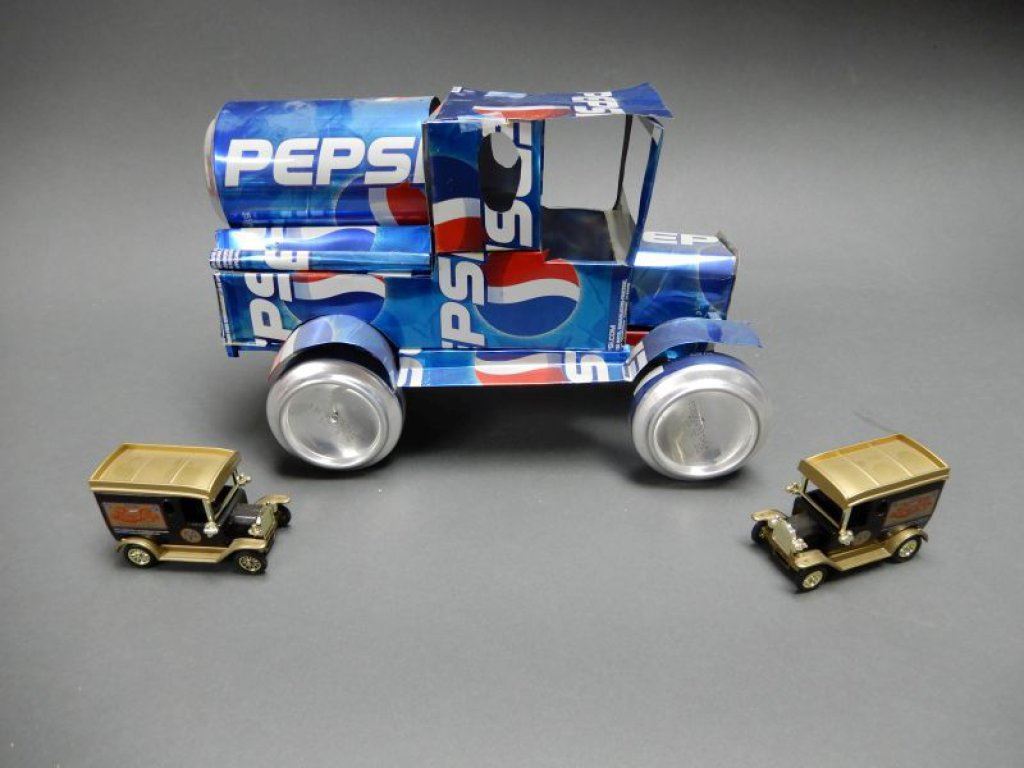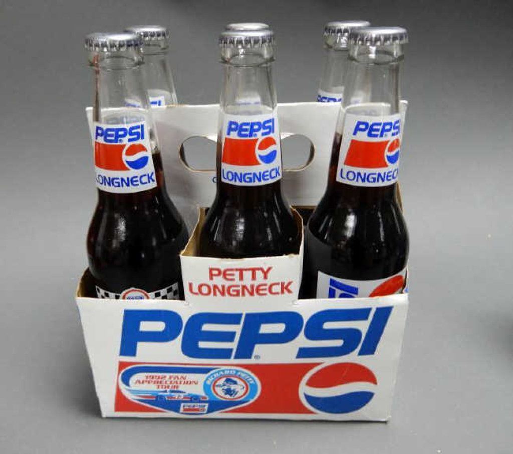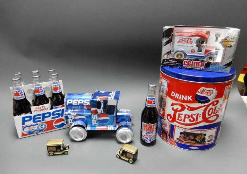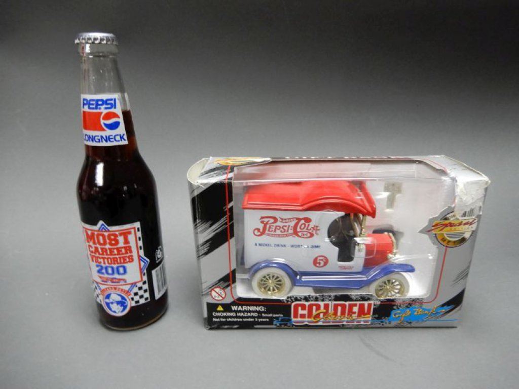 LOT OF PEPSI-COLA ITEMS RICHARD PETTY 6 PACK LONGNECK BOTTLES - PLUS ONE - FULL HANDMADE PEPSI CAN TRUCK DIE CAST GIFT BANK'/BOX 2 TOY TRUCKS POTOTO CHIP CANISTER LOCATION: LOWER RIGHT