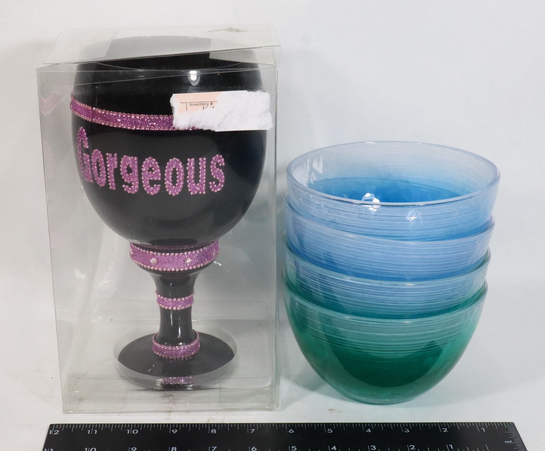4 PLASTIC BOWLS AND A LARGE NOVELTY CHALICE