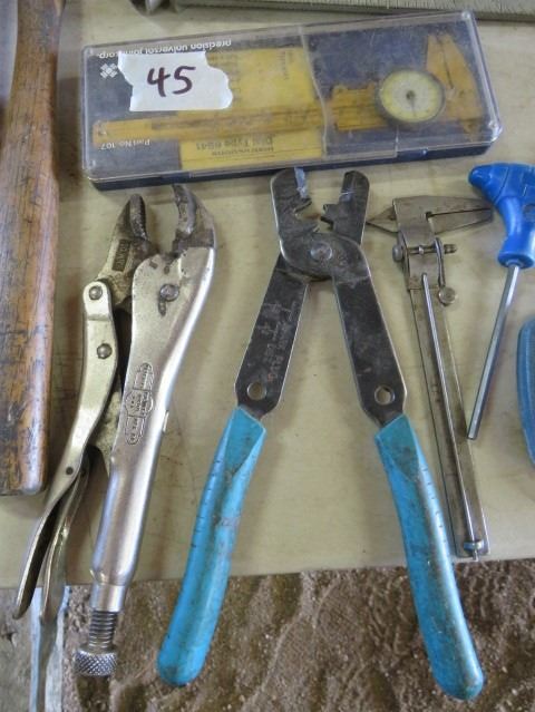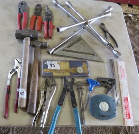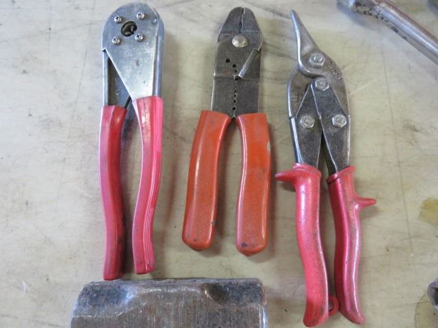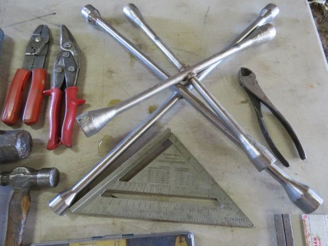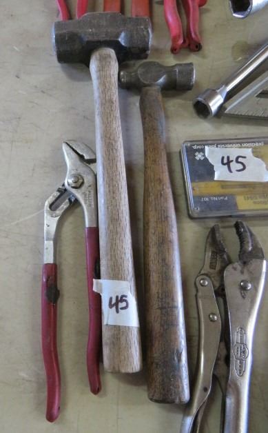 LOT OF RANDOM TOOLS (SLEDGE HAMMERS, TIRE GAUGES, PLIERS, SPEED WRENCH, ETC)