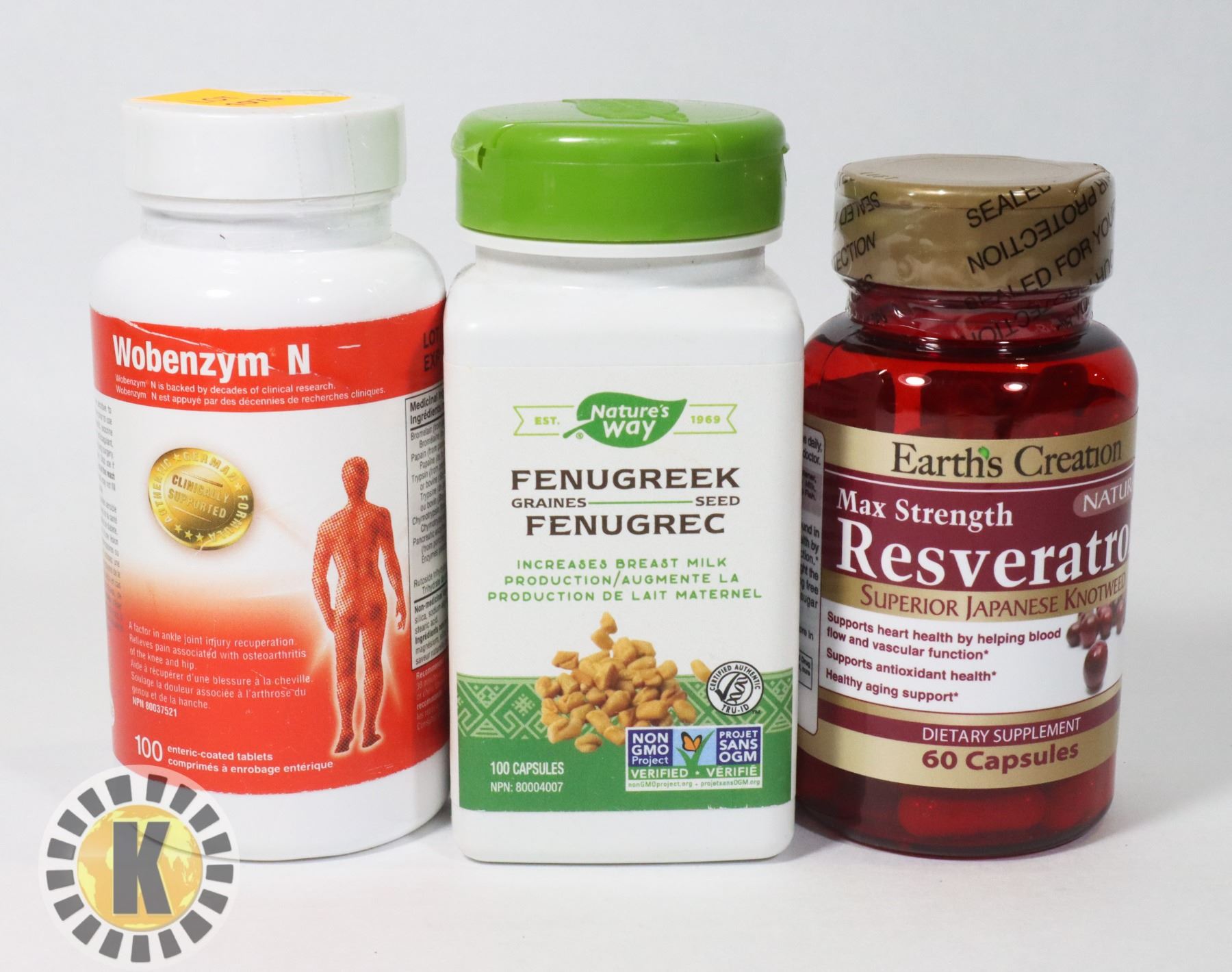 RESVERATROL 500MG 60 CAPSULES FENUGREEK 610MG100 CAPSULES WOBENZYM N 100 ENTERIC-COATED TABLETS***ITEM(S) LOCATED IN LETHBRIDGE ALBERTA. SMALL ITEMS ONLY ARE AVAILABLE FOR FREE TRANSPORT TO EDMONTON OFFICE (READ AUCTION DETAILS FOR MORE INFORMATION)