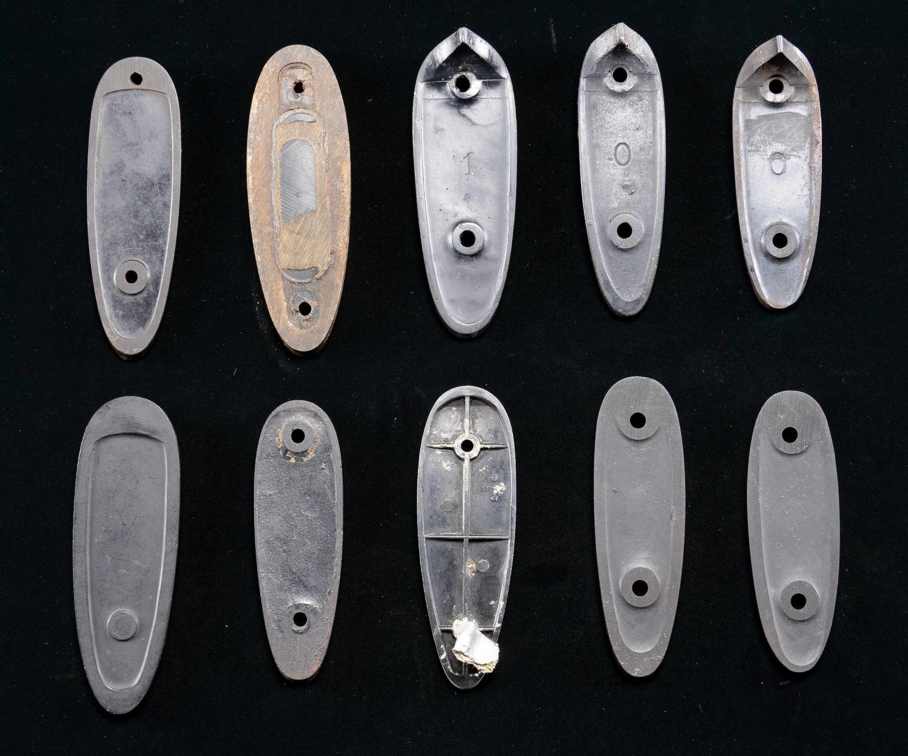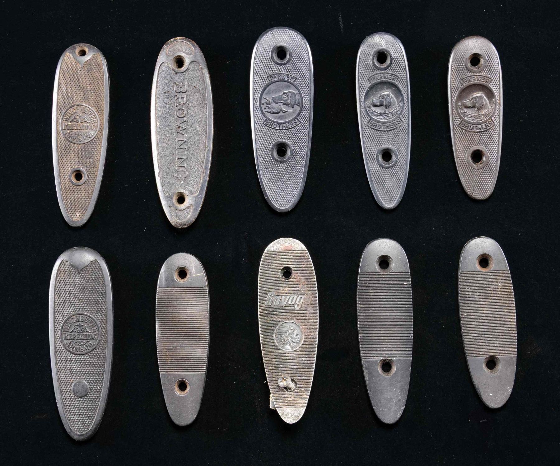 1 Savage grooved alloy buttplate. 1 Browning hard rubber buttplate. 2 Repro. Winchester hard rubber buttplates. 3 Repro. Parker Bros hard rubber buttplates. 3 grooved hard rubber buttplates. CONDITION: buttplates are in good intact condition with small holes in Browning buttplate & some show noticeable handling marks. (02-25044). NON-GUN. $400-800.