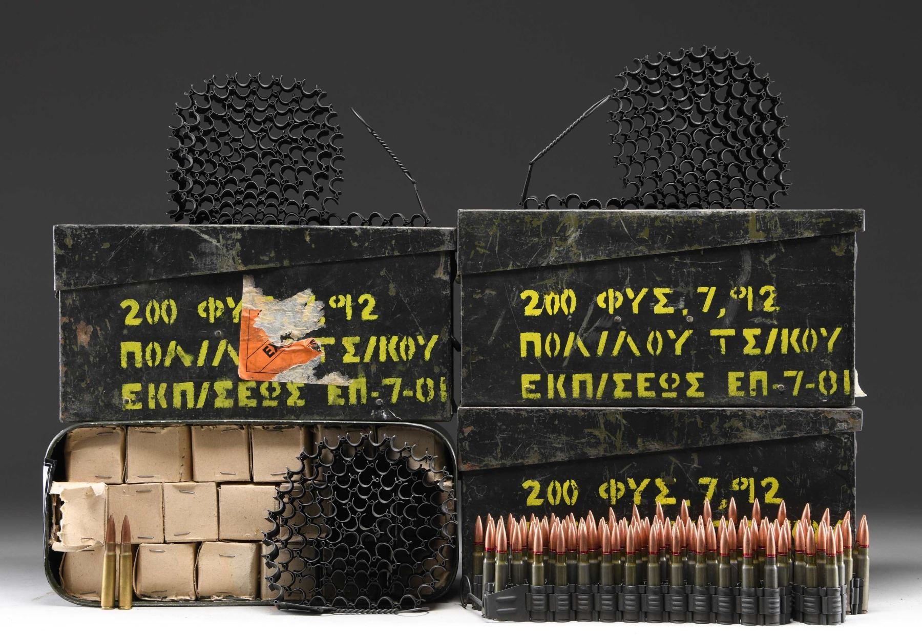 ZB37 MACHINE GUN BELTS. Lot of Romanian 8mm Mauser ammunition and Czech ZB37 machine gun belts, including: 1) 1 opened spam can of Romanian 8mm Mauser ammunition containing approx. 380-rds. of ammunition. 2) 2 loaded 100-rd. belts of assorted 8mm Mauser ammunition on Czech ZB37 belts, each with ammo can, 3) 1 100-rd. belt (approx. 90-rds. remaining) of assorted 8mm Mauser ammunition on a Czech ZB37 belt, with ammo can. 4) 21 unloaded Czech ZB37 machine gun belts. CONDITION: good, with belts all appearing serviceable. All boxes of ammunition remain sealed, save for one, which has been opened to verify contents. PROVENANCE: From the Estate of Ivan Lee Shapiro. (02-23495-59/MLW). AMMO. $300-500.