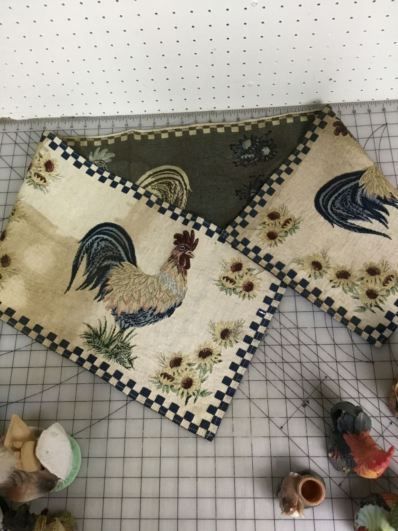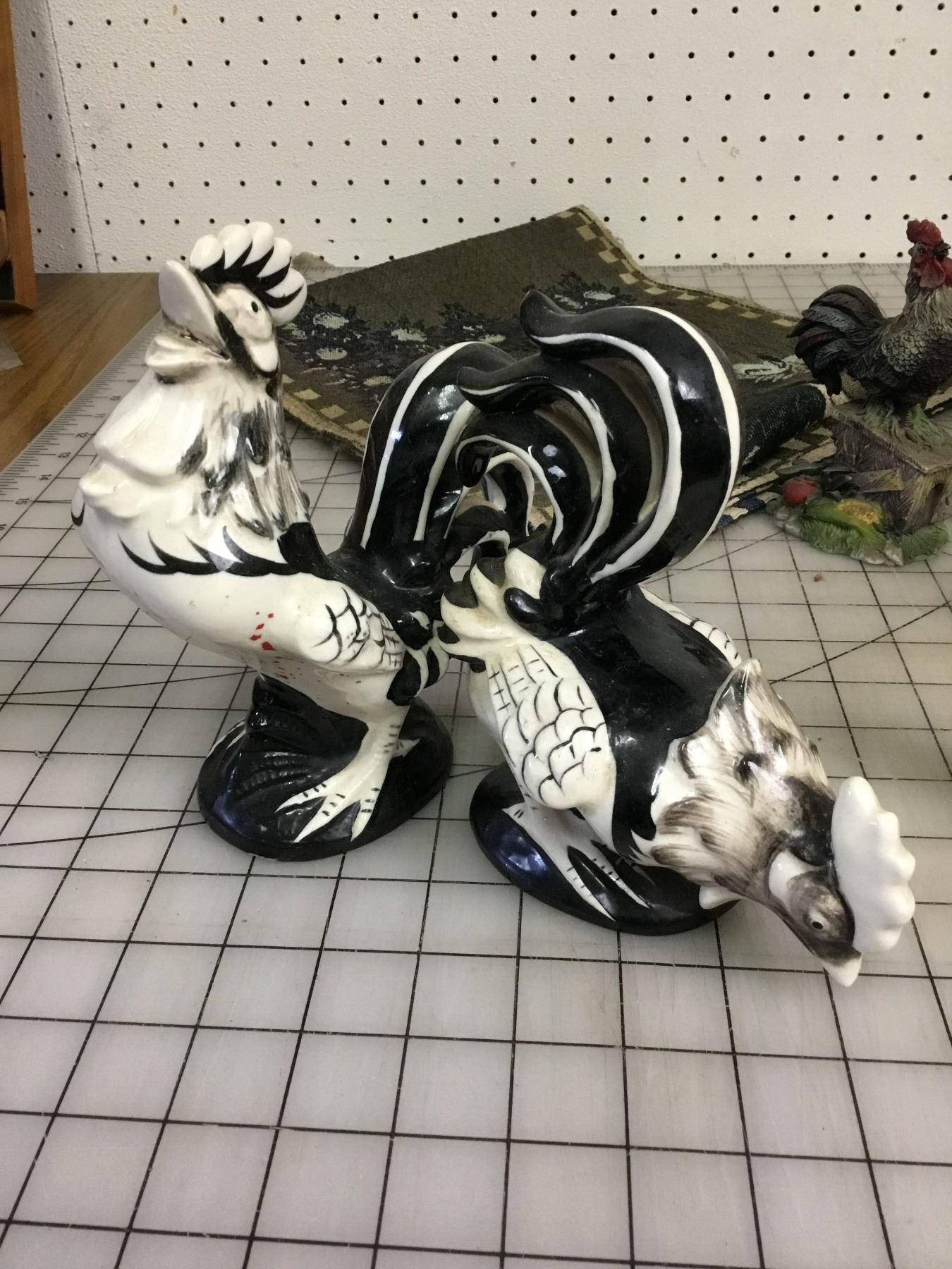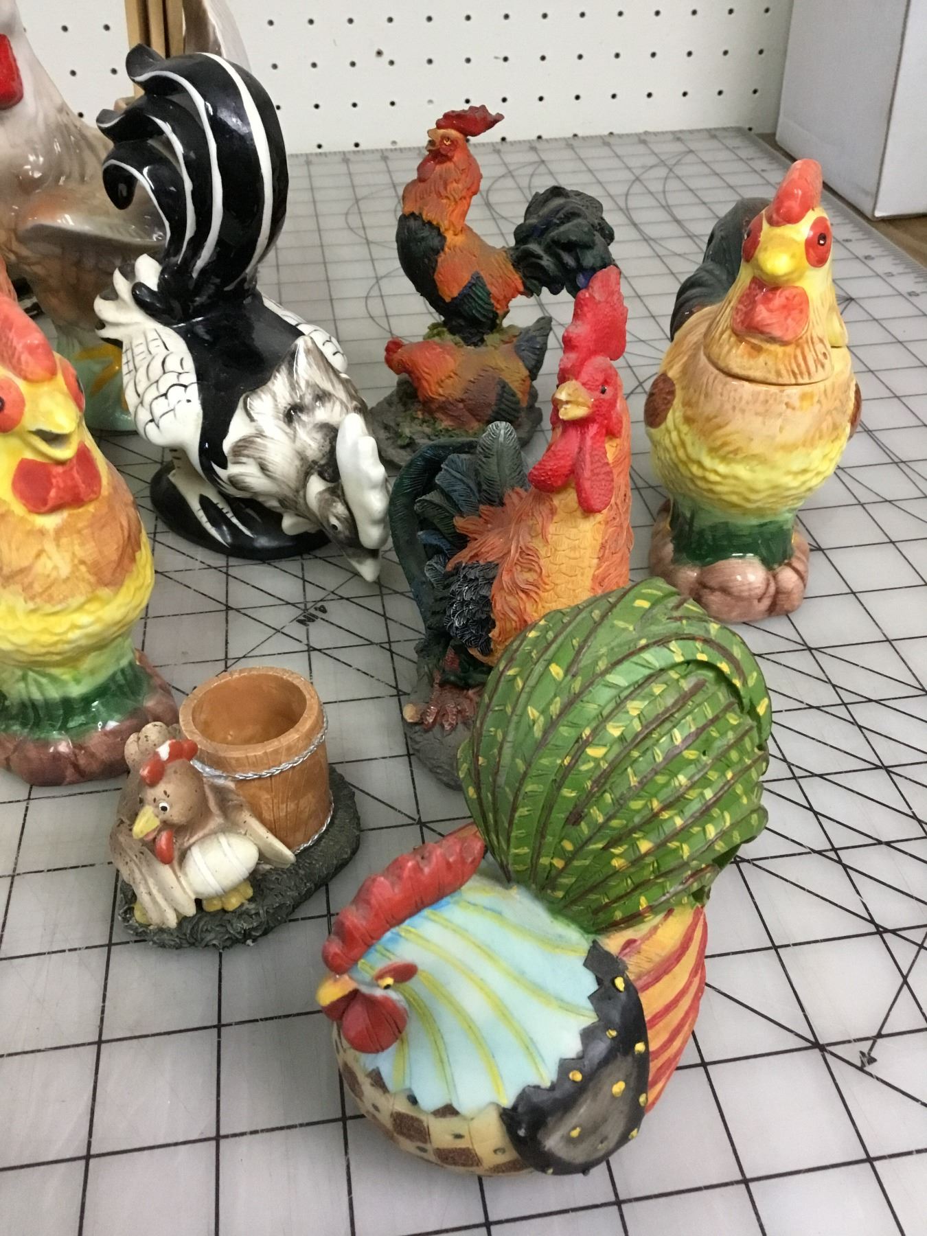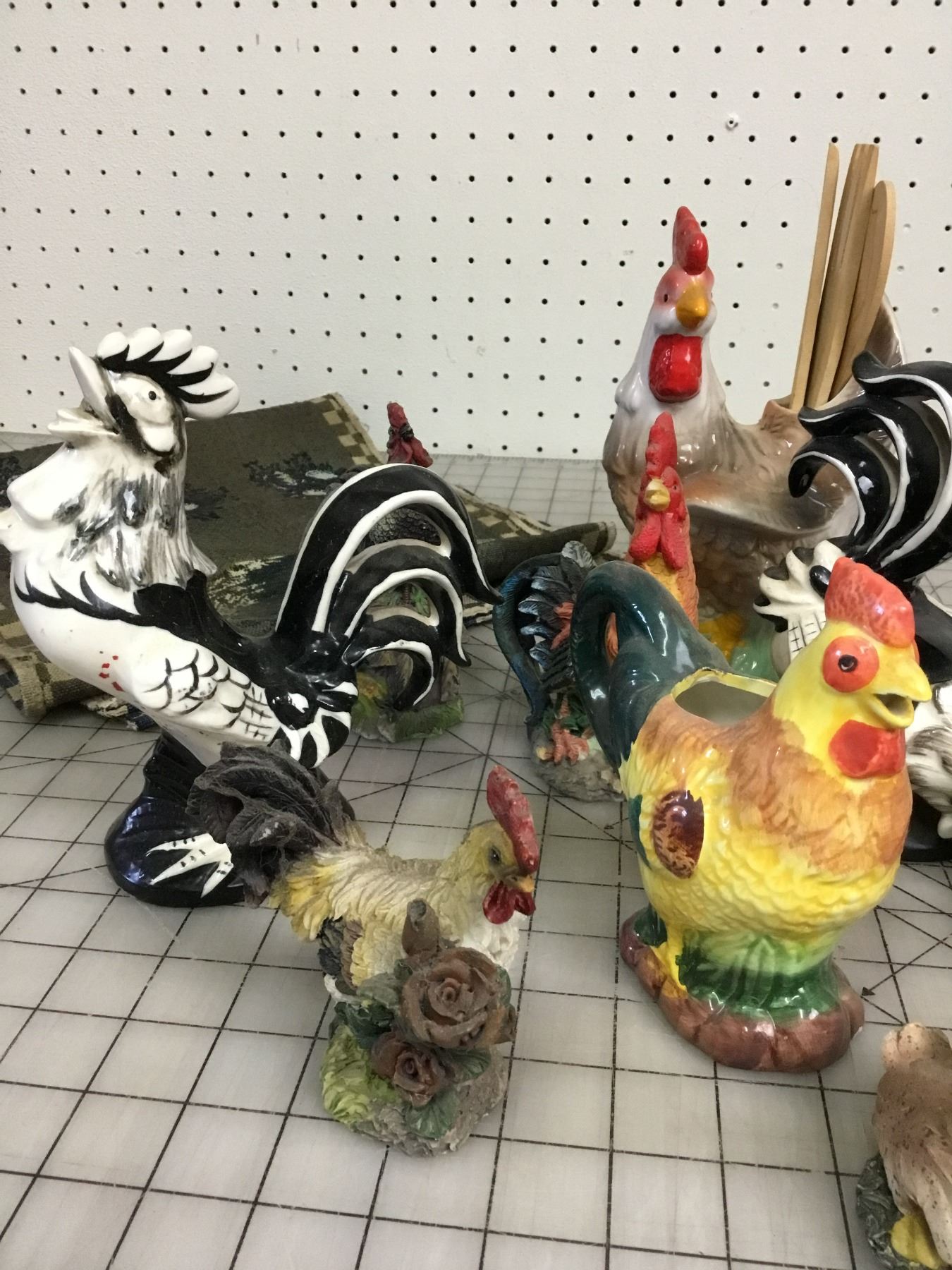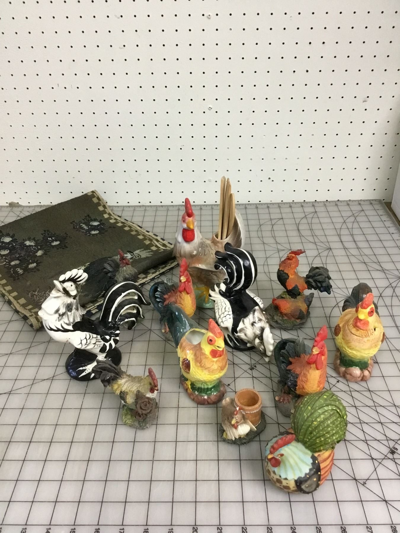 LOT OF ROOSTER FIGURINES AND TABLE RUNNER