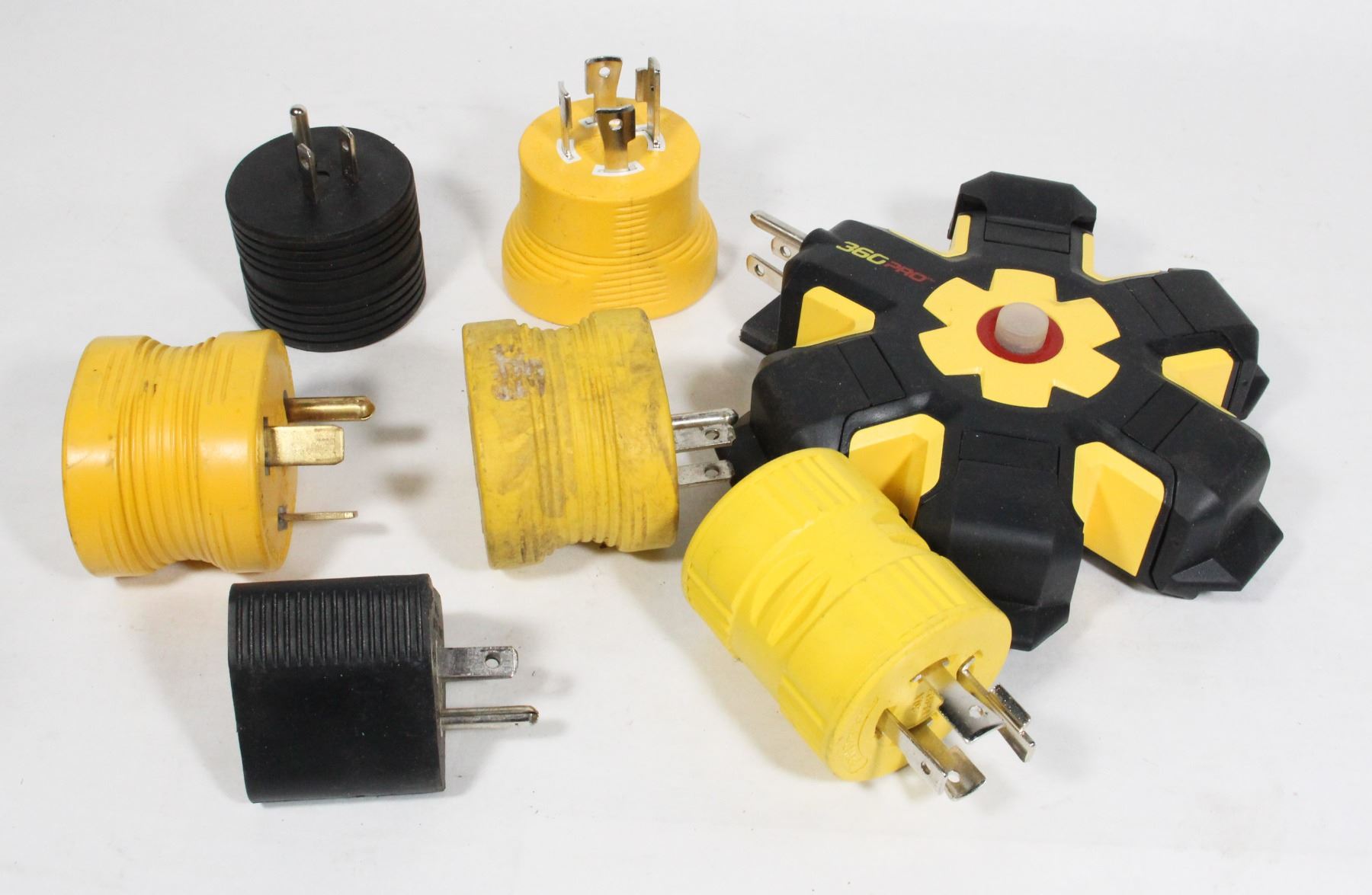 LOT OF RV POWER ADAPTERS AND POWER BARS