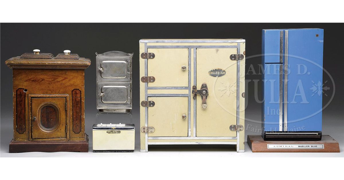 Lot includes what appears to be a patent model for an ice box with zinc interior and wire shelves (no patent tag), an all tin salesman sample ice box with dome top, a salesman sample "Chilled-Air" ice box, a Frigidaire floor cooler premium and an Admiral Mueller Blue wooden store display side-by-side fridge. SIZE: Largest 12" h x 11" w x 3-1/2" d. CONDITION: Good to very good with "Chilled-Air" ice box having various chips and paint loss. 1-13612