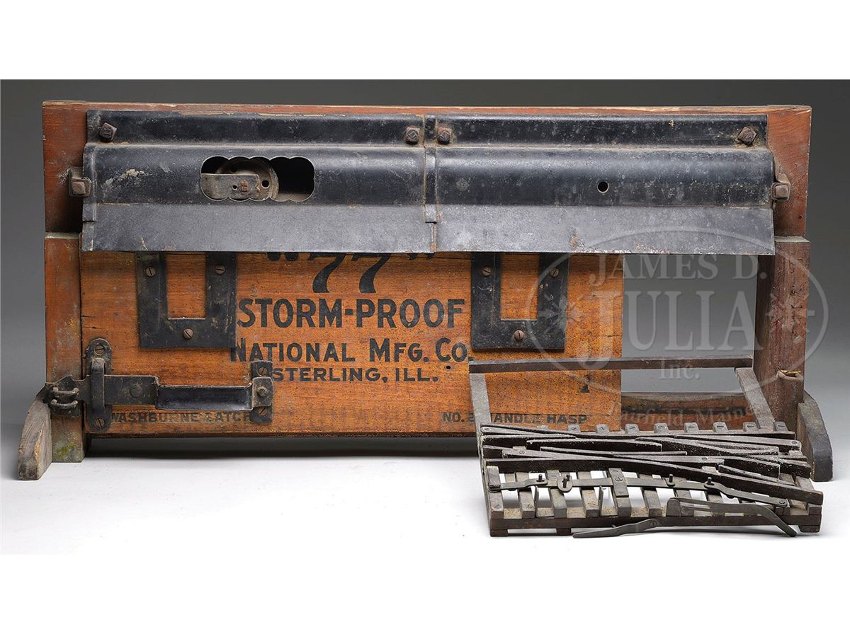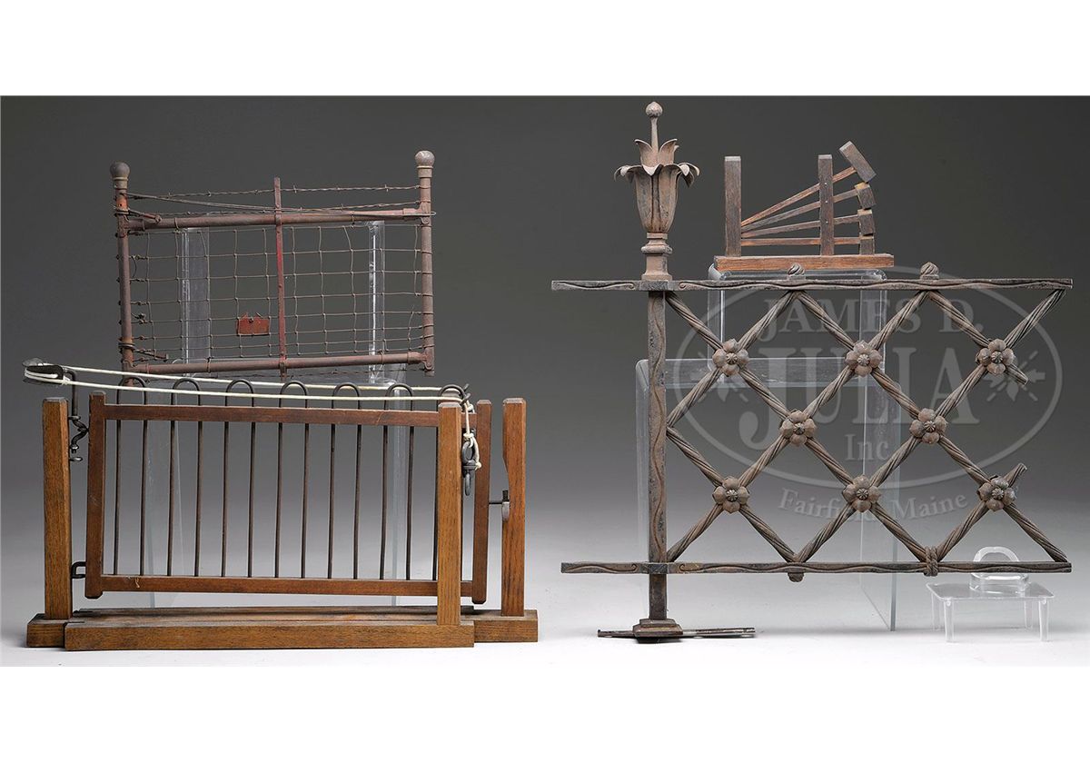 Lot includes 1) Cast iron gate with criss-cross rope pattern and floral accents. 2) Mesh work gate with barbed wire top. 3) Miniature collapsible gate with "tumbledown stiles" that allows farmer to push down the horizontals but still keeps the animals out. Retains partial paper label on bottom. 4) Folding collapsible remote access gate that by the pull of a rope (replaced) and gravity would open the gate allowing passage through. 5) Large "77 Storm-Proof" hanging door by National Manufacturing Co. of Sterling, Illinois with a Washburne latch. 6) Stretch of wooden switch track. SIZE: Largest 33" l x 15-1/2" h. CONDITION: Good to very good. Metal components showing oxidation. Wood shows some evidence of mildew. 1-13562