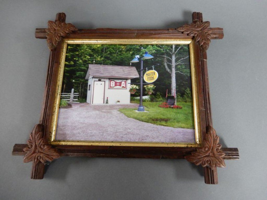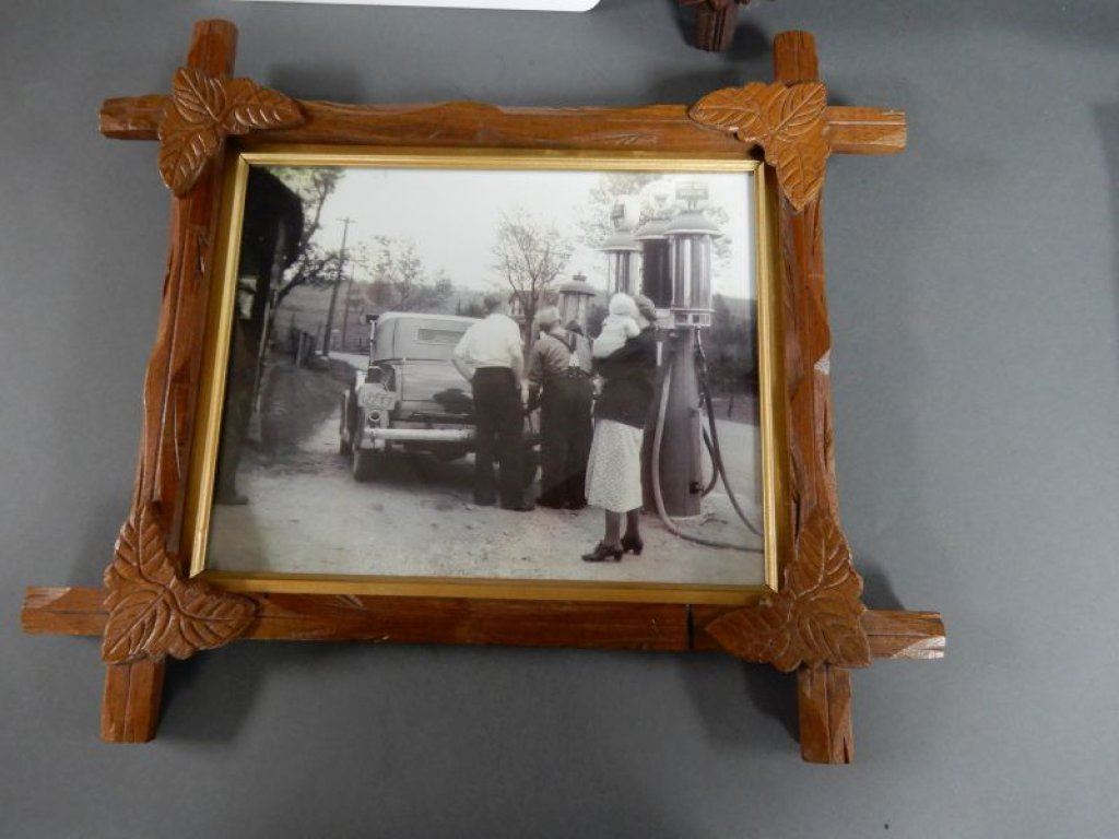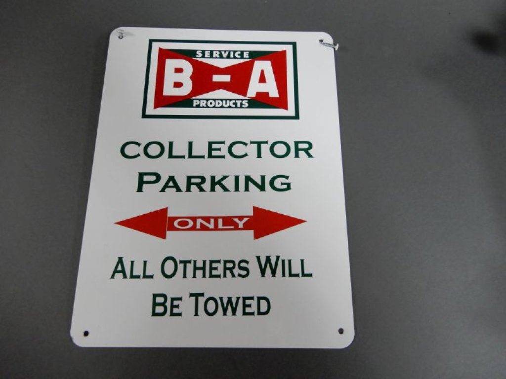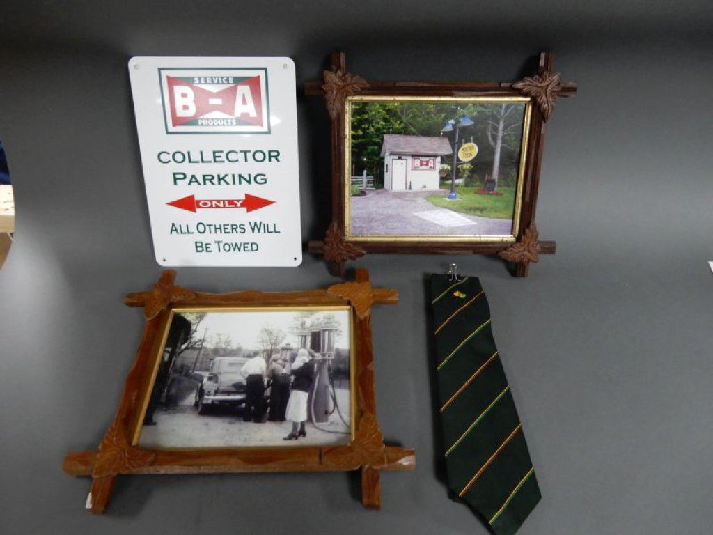 LOT OF SERVICE STATION COLLECTIBLES 2 FRAMED GAS PICTURES- B-A BOWTIE PARKING SIGN- REPRO- BP TIE LOCATION: LOWER BACKROOM
