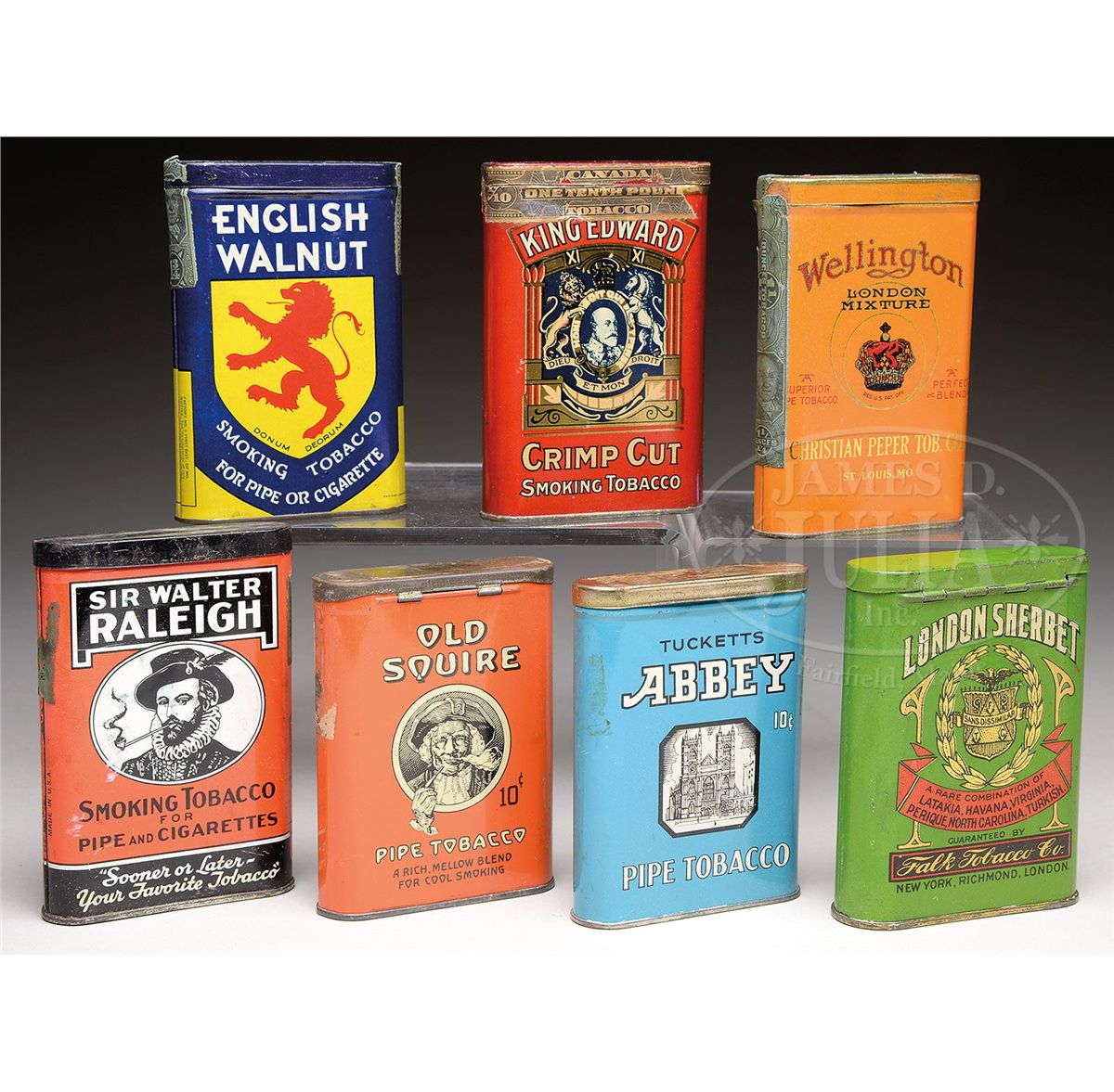 1) Tucketts Abbey; 2) Wellington London Mixture; 3) London Sherbet Mixture; 4) English Walnut; 5) Sir Walter Raleigh; 6) King Edward Crimp Cut; 7) Old Squire Pipe Tobacco. SIZE: 1) 4"; 2) 4-3/8"; 3) 4-1/8"; 4) 4-3/8"; 5) 4-1/2"; 6) 4-1/2"; 7) 4". CONDITION: 1) Very good to excellent; 2) Near excellent; 3) Very good; 4) Near excellent; 5) Very good; 6) Near excellent; 7) Near excellent. 1-13226-28